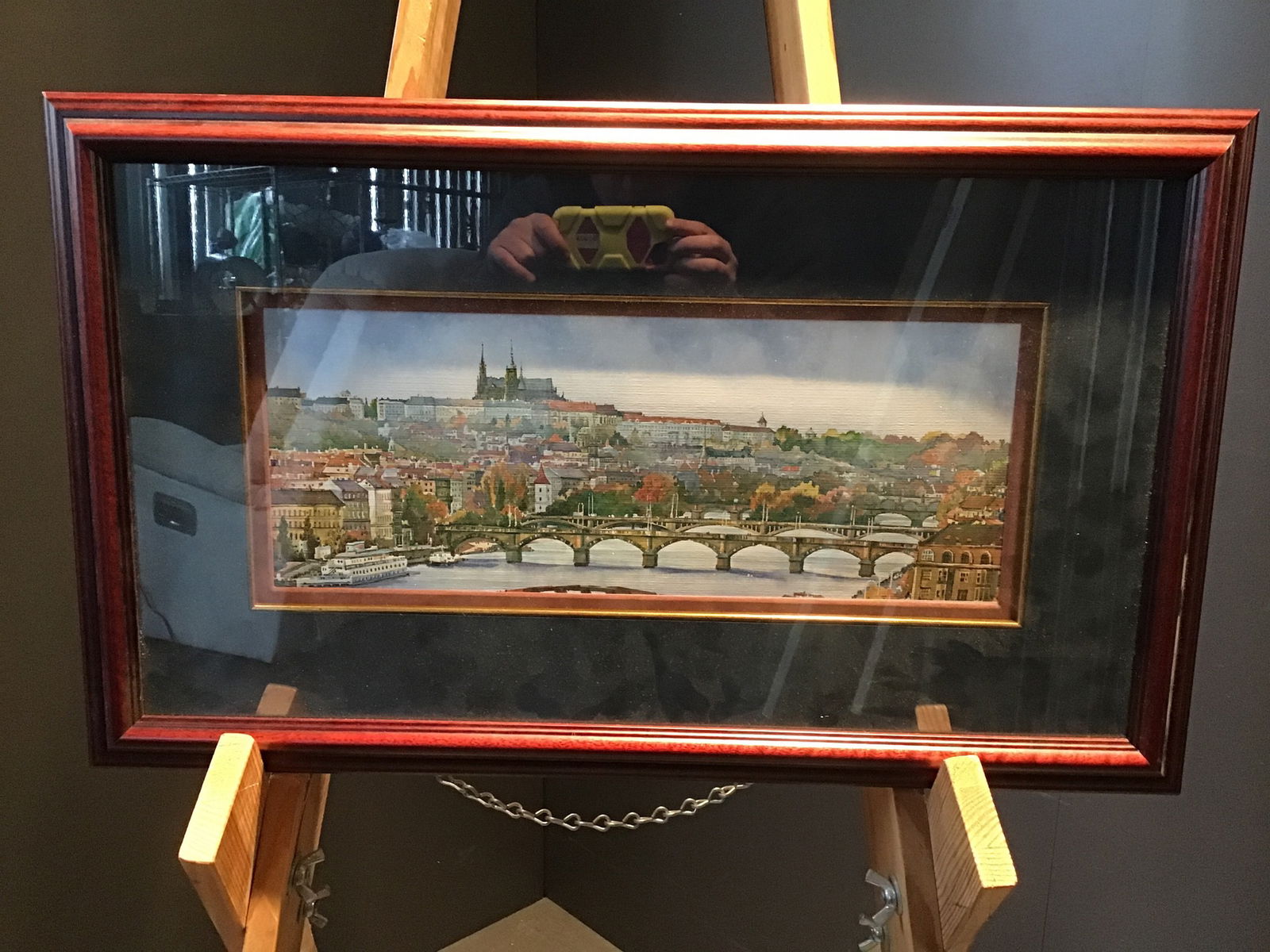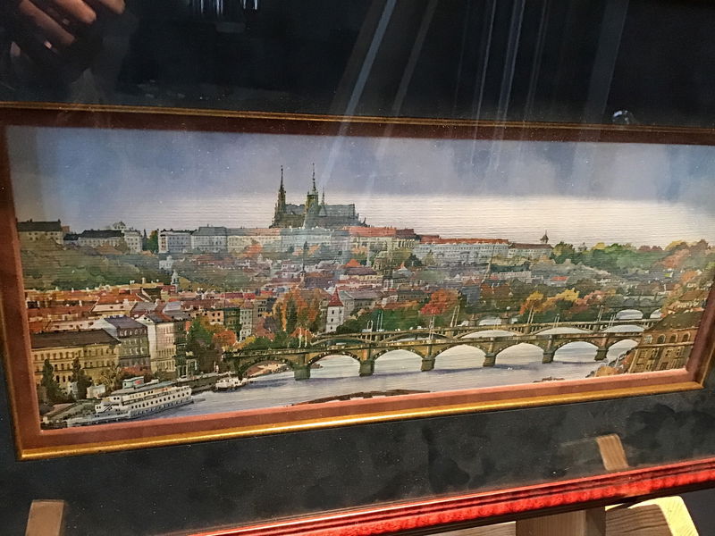Lovely print of a painting of what appears to be the famous Charles Bridge in Prague, Czecc Republic. Shows the beautiful skyline over the Vltava river. The real kicker is the amazing frame work on this piece, marbled blue background with gold trim around the border and lovely cherry colored wood frame around it.