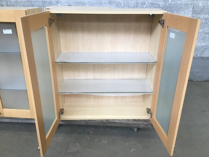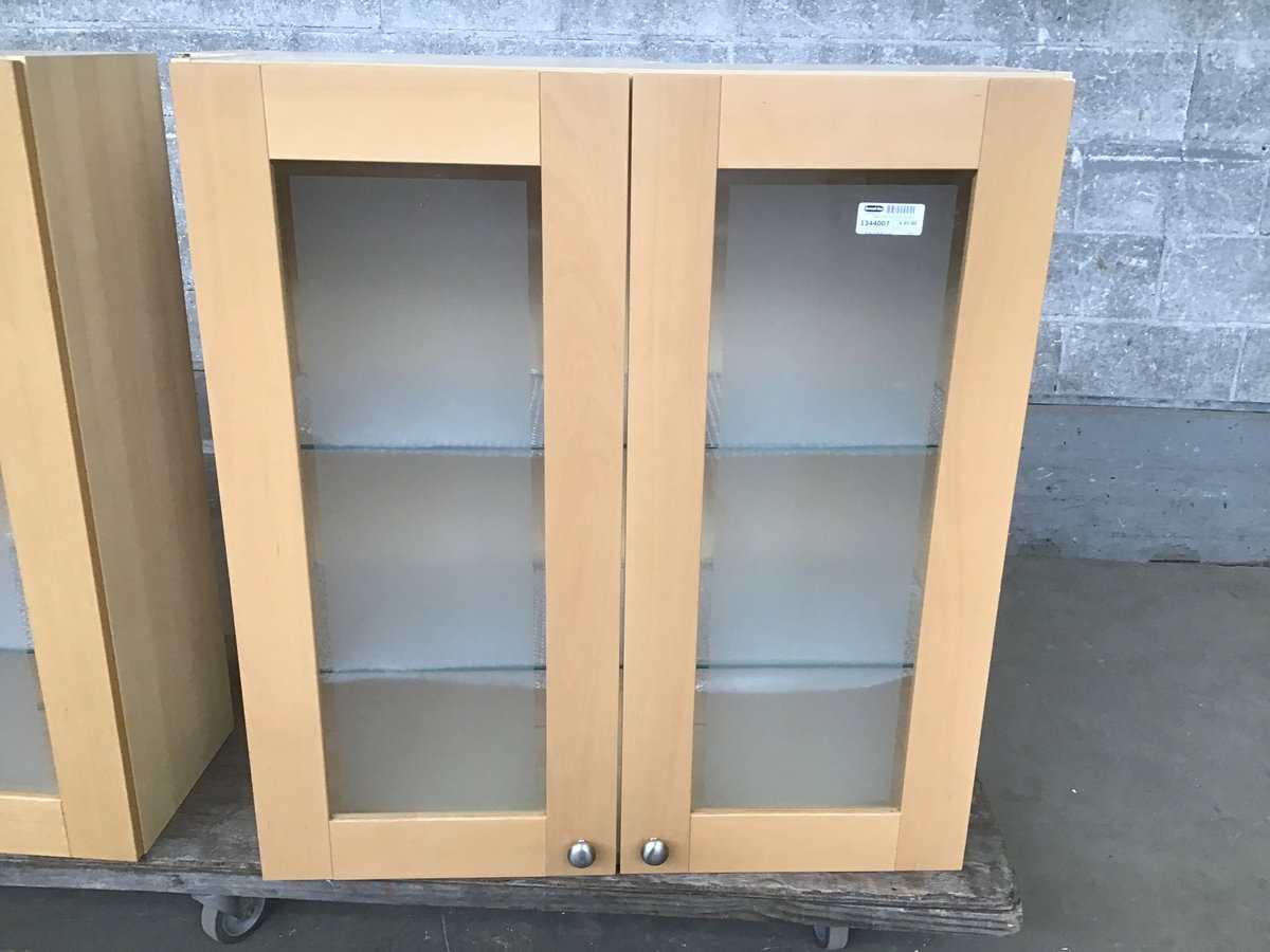Ikea glass door upper with shaker-esque cabinet doors in a naturally finished Beech wood. Inside are two adjustable height glass shelves.