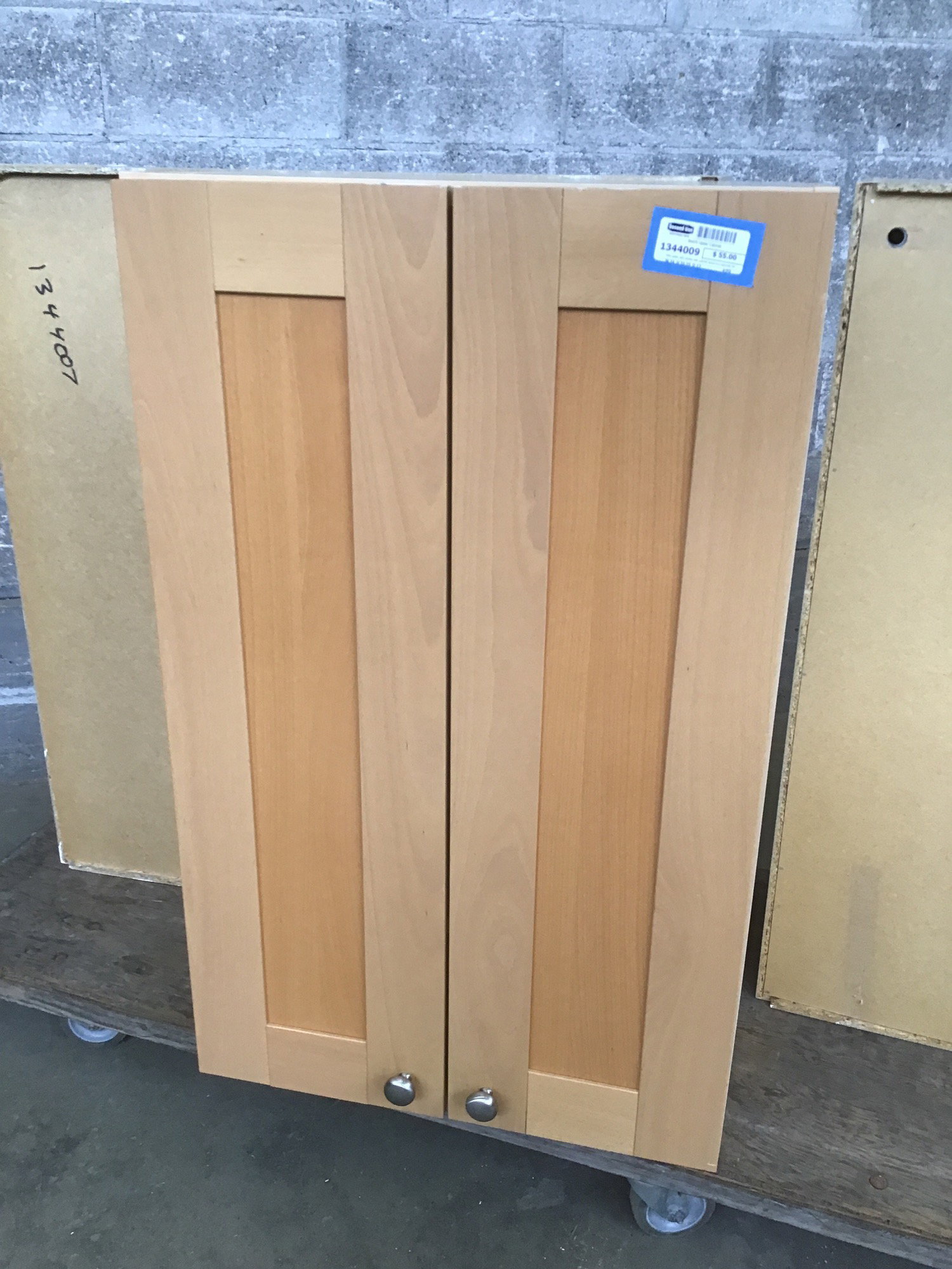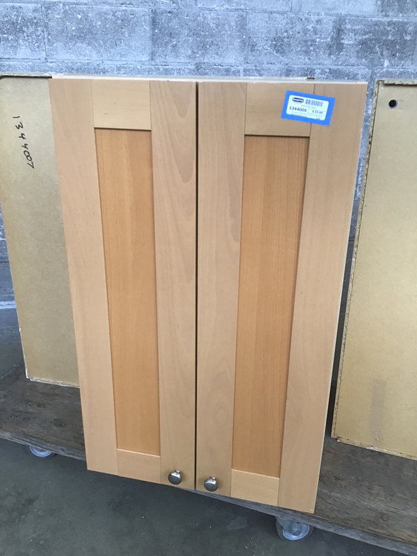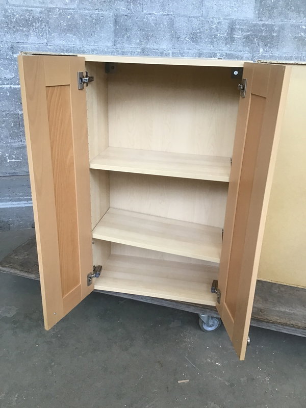 Ikea upper with shaker-esque cabinet doors in a naturally finished Beech wood. Inside are two adjustable height shelves.