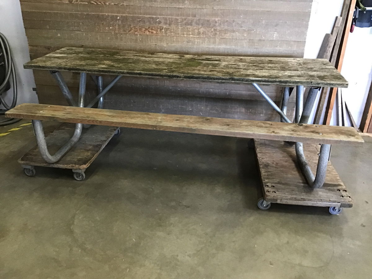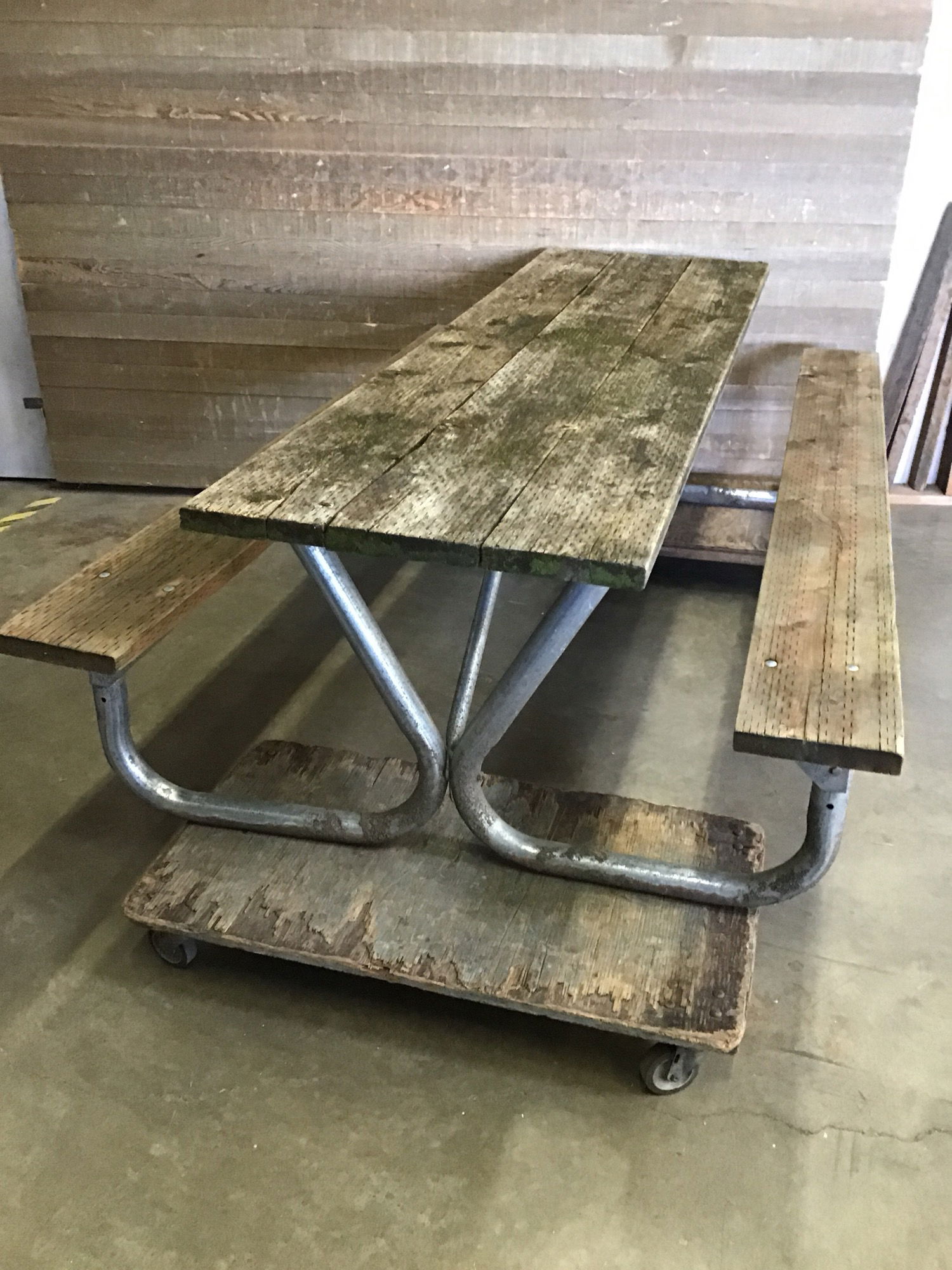 Beefy 8' wood picnic table in good, used condition. Picked up from a local school, this table is made up of treated wood planks as top and benches with heavy duty galvanized steel base. Shows a fair amount of weathering from being outside, but could be powerwashed and cleaned up fairly easily.