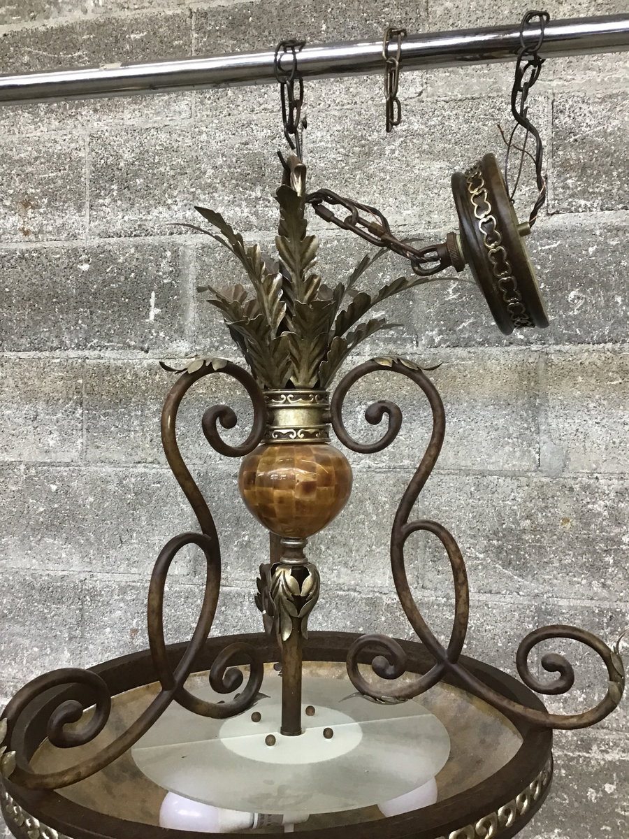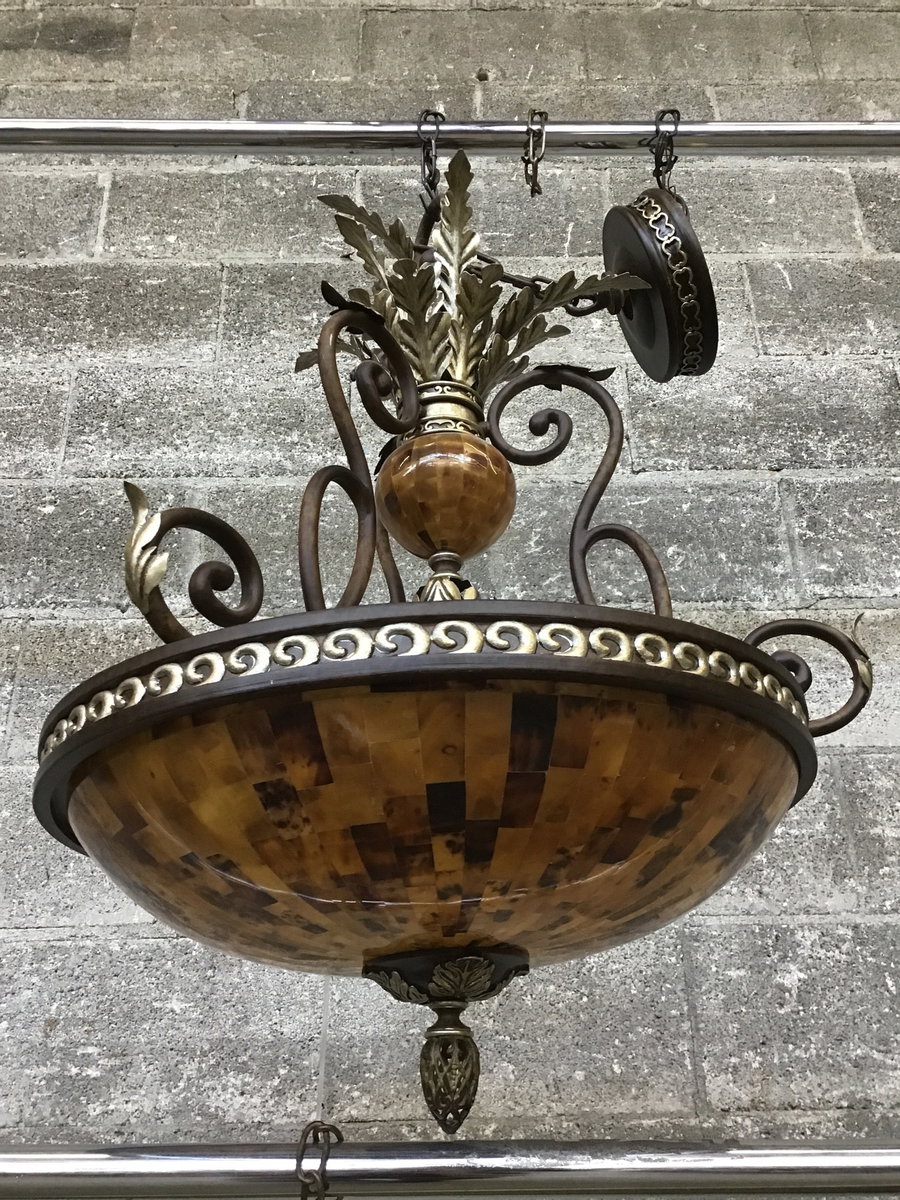 You've seen acorns. Maybe you've seen pineapples. But I'll bet you've never seen a ceiling light with a golden beet as its shining center star. This one is constructed of fiberglass with a tiled appearance and is suspended amid scroll arms with acanthus leaf shoulder pads, all above a large bowl that mirrors the same look as the precious golden beet. It's beet season, why not celebrate it with a light fixture and a little gusto? Suitable for dry locations only.