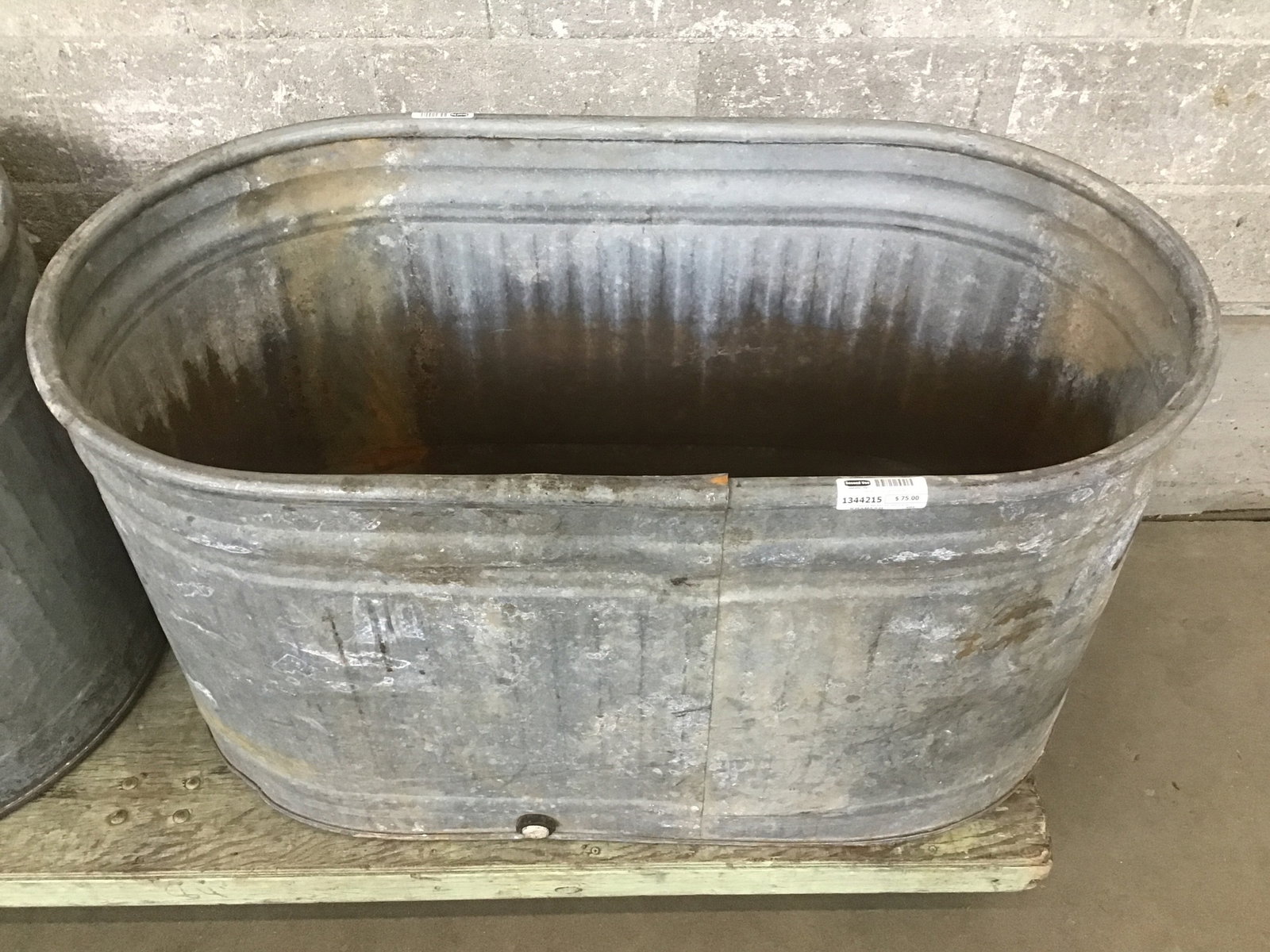 Galvanized steel stock tank made by Behlen. There are no holes in the bottom for drainage, but easy enough to change it into a planter.