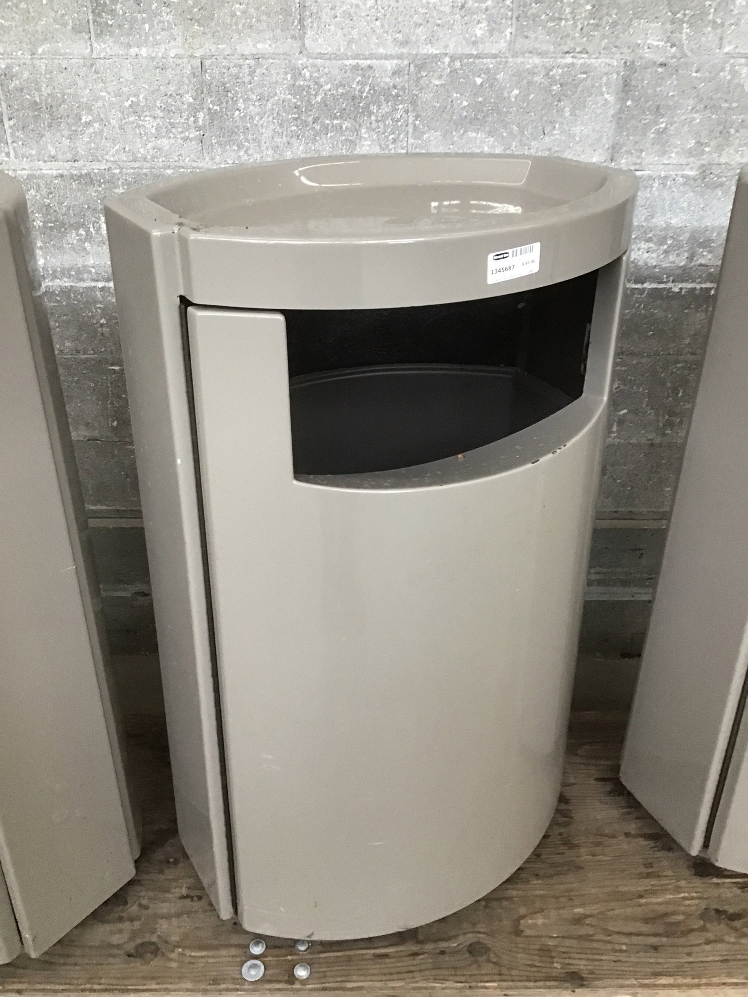 A trash can with a big sturdy shell in a kind of grey-ge tone. It has a little latch that you have to stick your arm into the can to reach so you can open it and swap the bag out. Has a couple dings and nicks here and there, as is to be expected for a trash can.