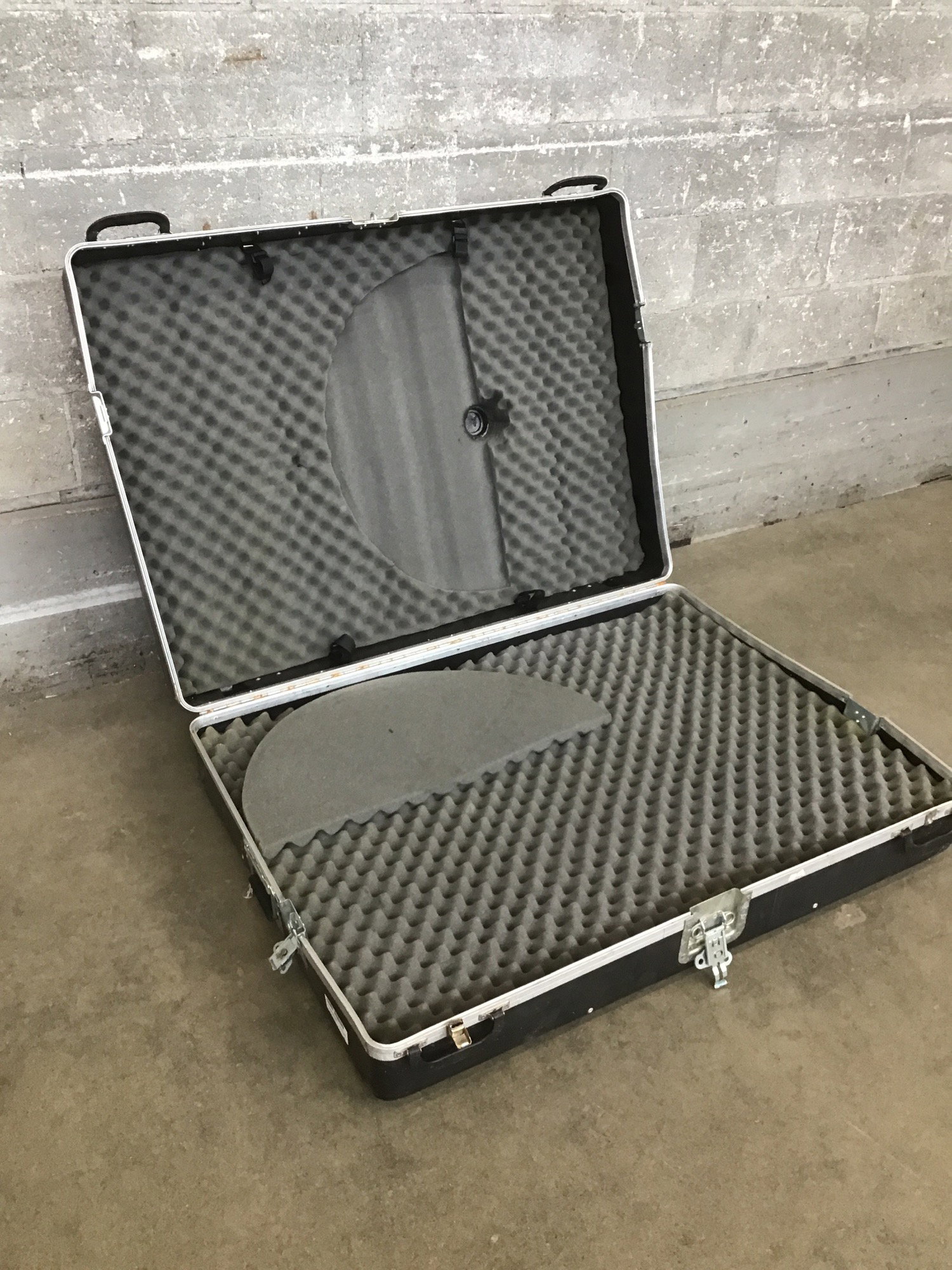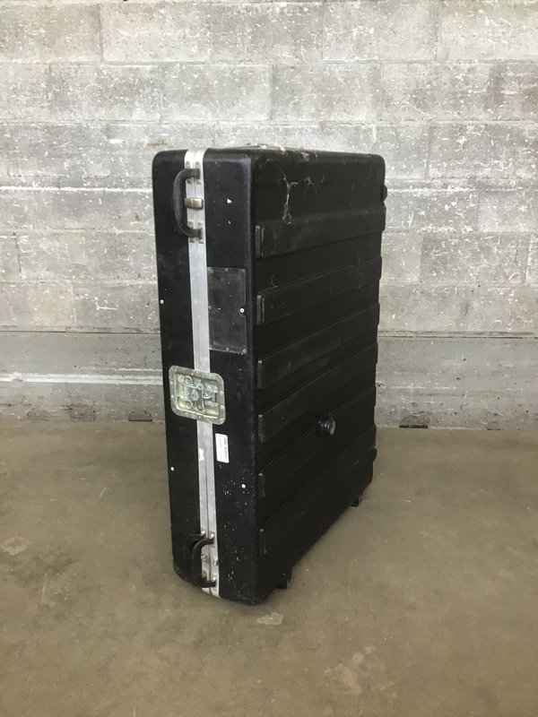 A sizeable road case with some foam padding and straps inside. It's a little bent out of shape on one end (still latcheds closed just fine) and needs a good cleaning, but in decent shape overall.
