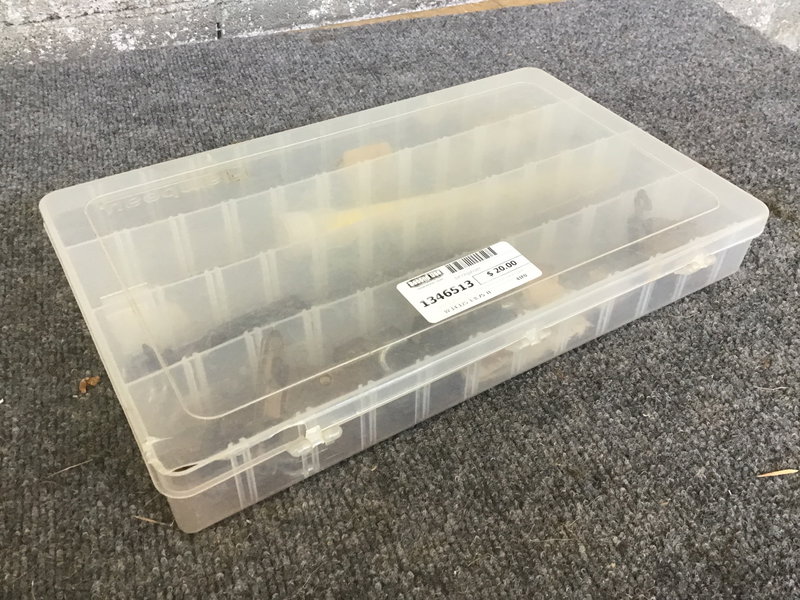 A bit organizer that's currently filled up with some miscellaneous hardware and little slats to adjust the setup. In total, there are about 48 potential little spaces for organizing your bits (though you'll probably need to make a couple of the little dividers, though).
