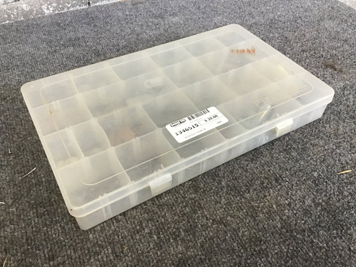 A bit organizer that's currently filled up with some miscellaneous hardware and little slats to adjust the setup. In total, there are about 48 potential little spaces for organizing your bits (though you'll probably need to make a couple of the little dividers, though).
