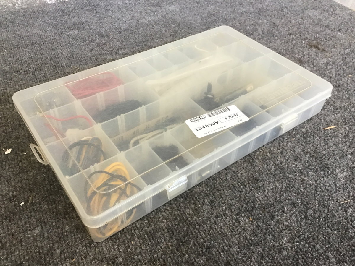A bit organizer that's currently filled up with some miscellaneous hardware and little slats to adjust the setup. In total, there are about 48 potential little spaces for organizing your bits (though you'll probably need to make a couple of the little dividers, though).