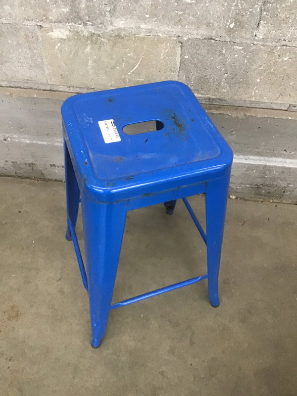 A steel bar stool with a blue paint job. The paint's a bit bubbly up top, but it's not in terrible shape.