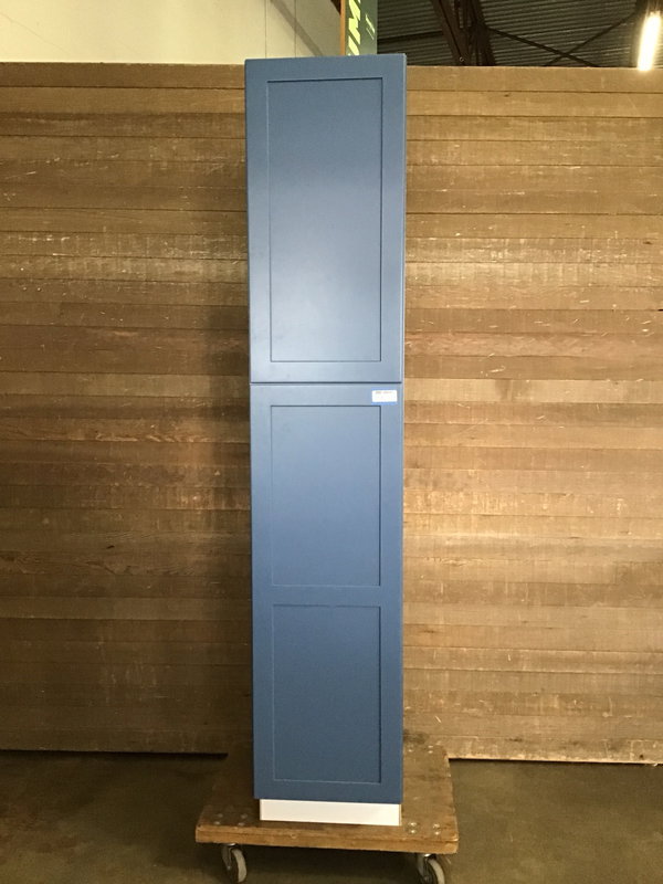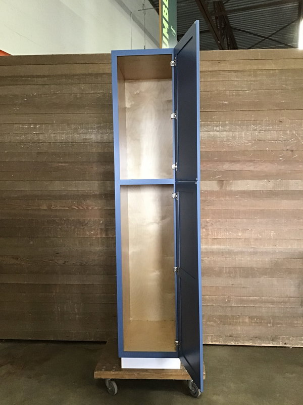 Nice tall pantry cabinet with blue painted recessed shaker style panel doors, soft close hardware and plywood box construction. In fantastic shape and never installed.