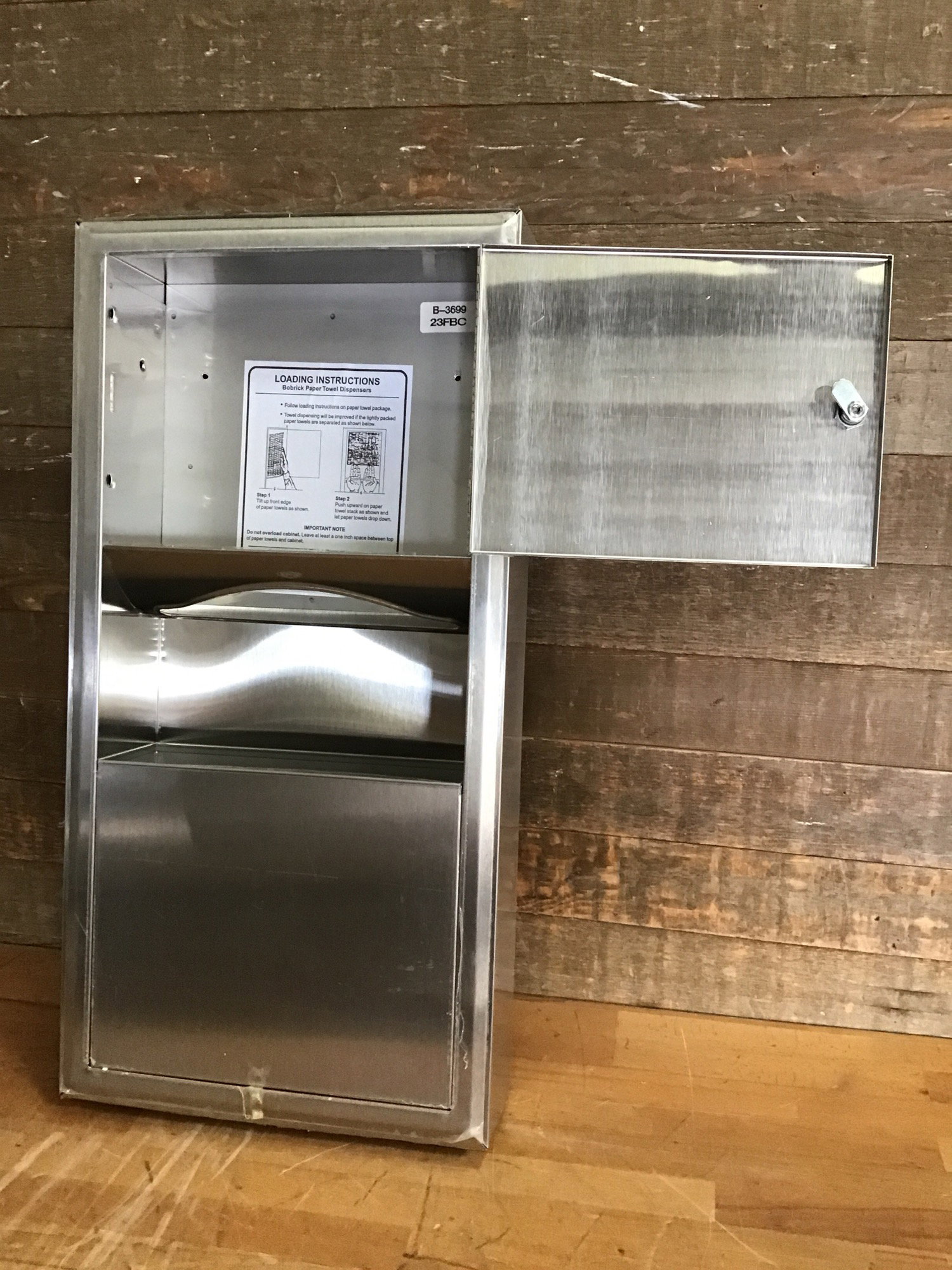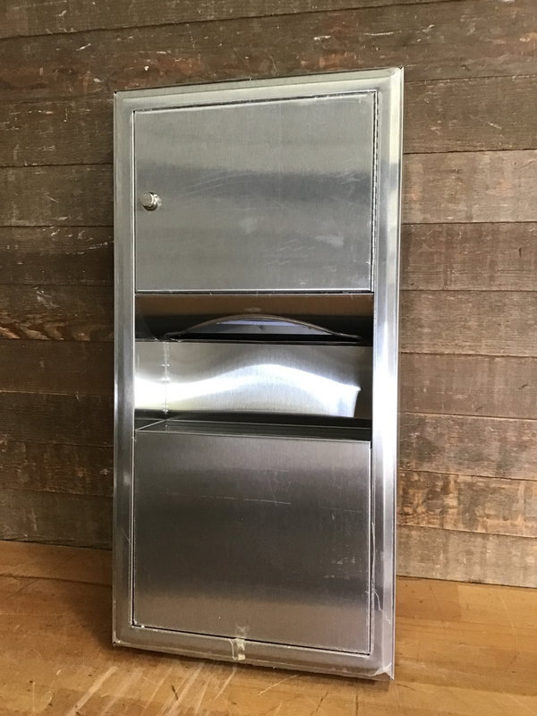 Bobrick model B-3699 commercial stainless steel paper towel dispenser and waste receptacle. Wall mountable. Sells new online for over $300, see here for details and specs.