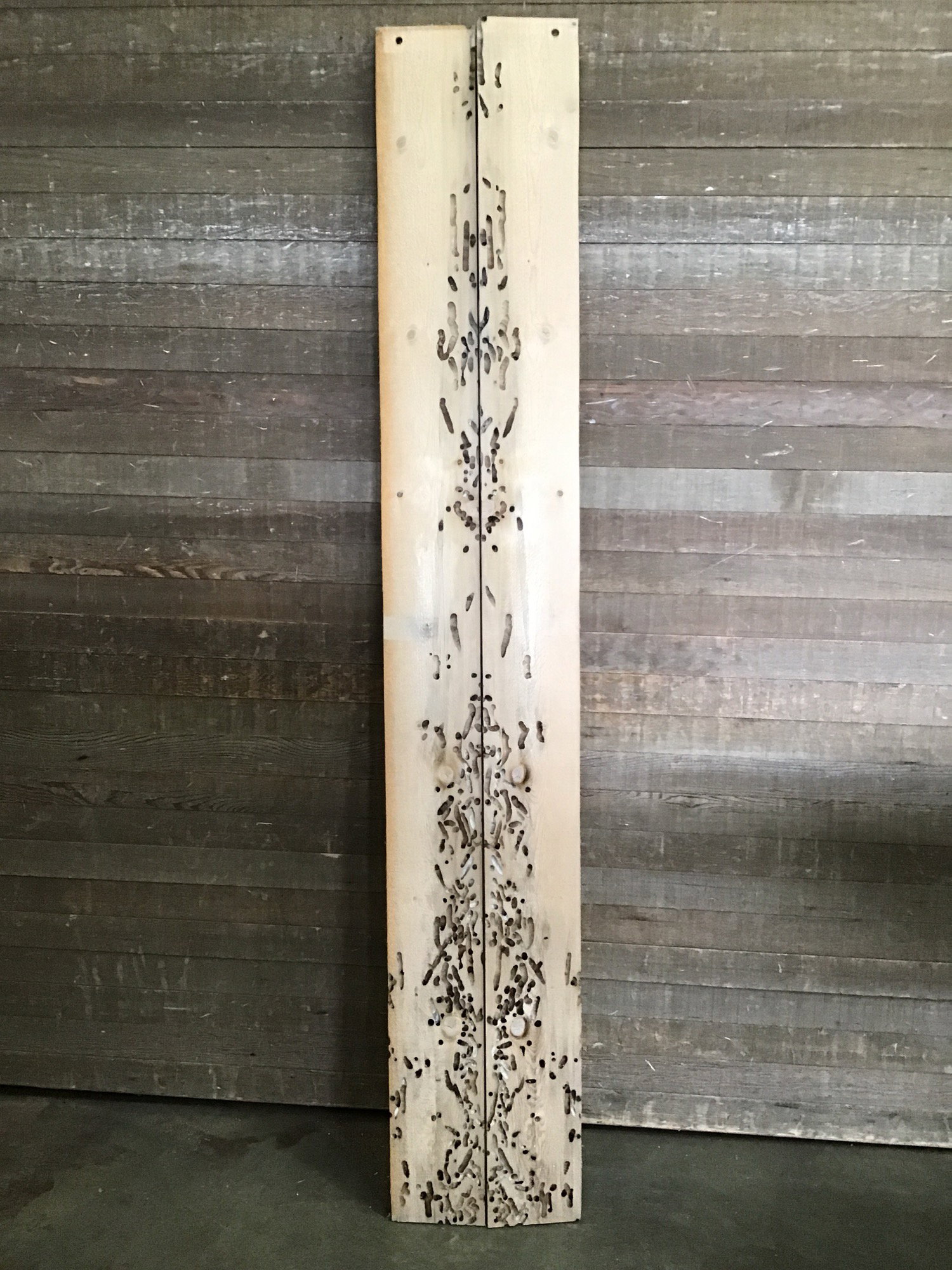 Locally milled & kiln dried, reclaimed hem that was formerly submerged in local saltwaters & used in the Pacific Northwest timber transport trade. Dimensions are for both pieces laid flat.