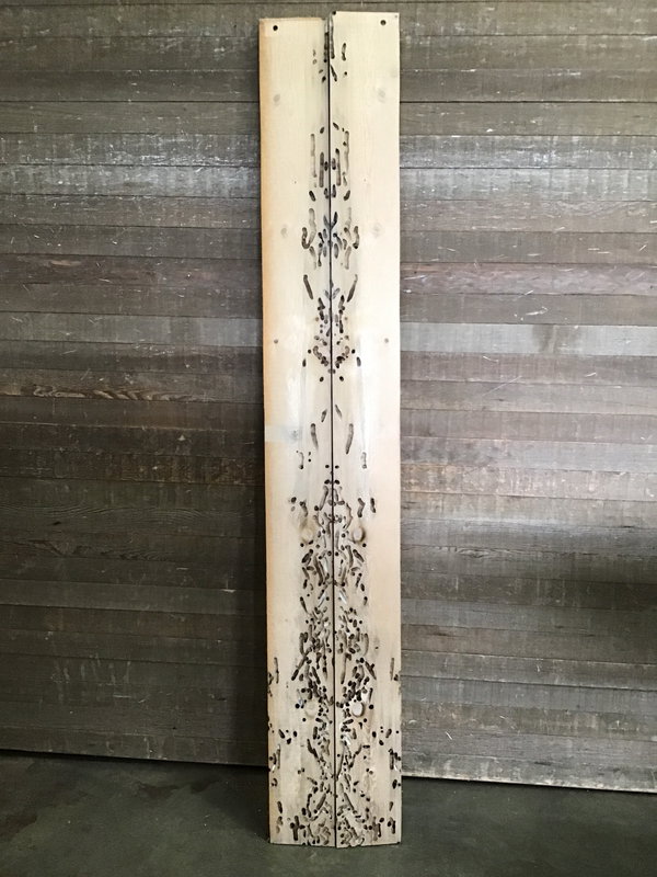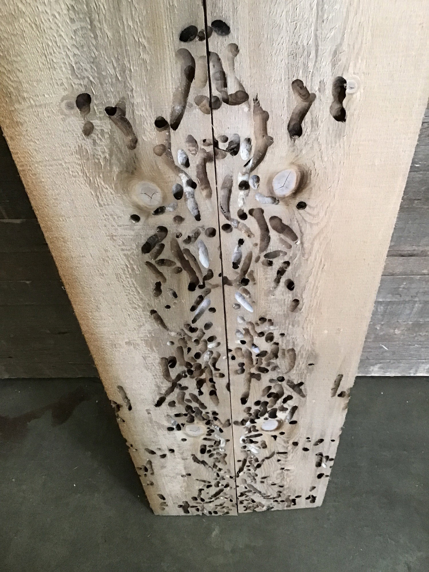 Fantastic piece for all sorts of projects with traces of life long gone in the channels left behind by the seafaring teredo clam as well as the tiny punctuations of the gribbles who settle in afterward; the handiwork of annelids, mollusks and arthropods.