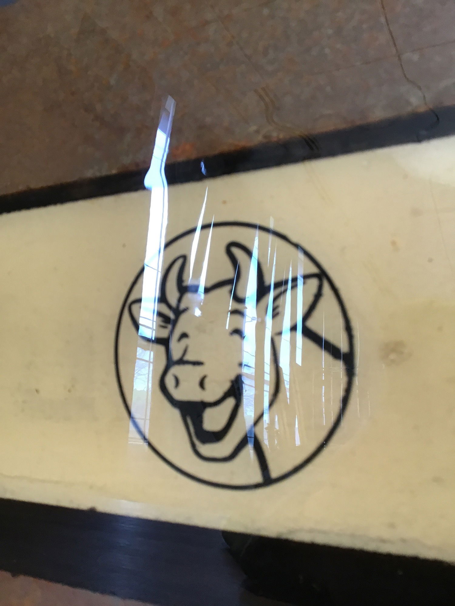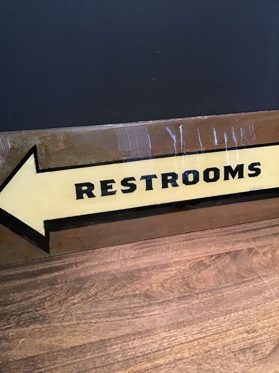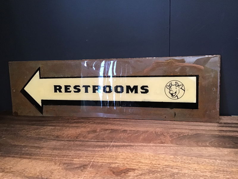 Incredible vintage restroom sign we think from Laughing Cow Cheese or some sort of dairy establishment. Covered in epoxy against a tin backing piece and fairly large as well this is pretty neat! Has an arrow pointing to the left as well as a really happy cow on the sign. Seems to be in great shape and can help you locate the facilities too!