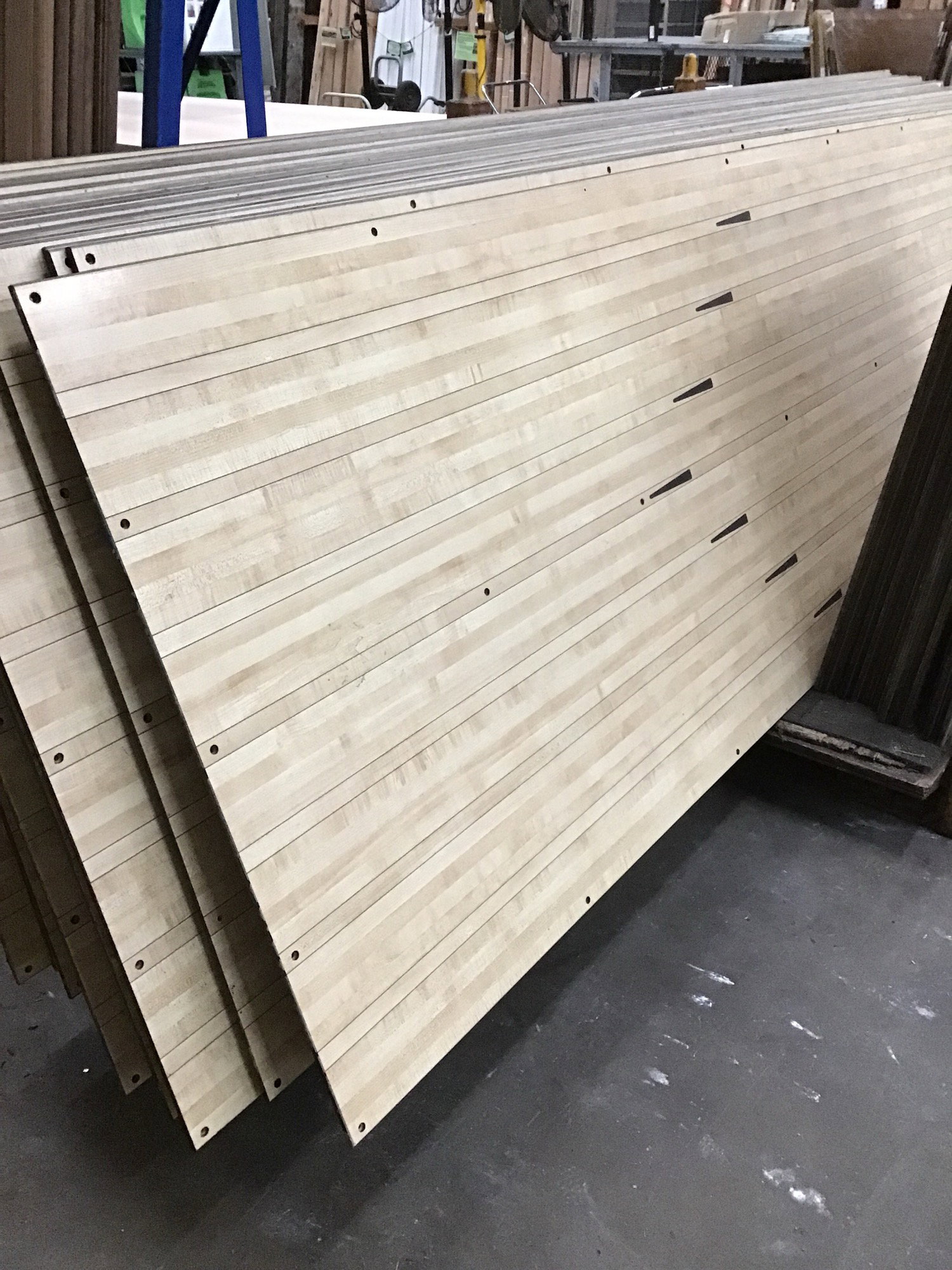 Former bowling lane topper with arrows (the newer synthetic lane that now gets put on top of older woodlanes that are too thin to resurface) that is comprised of some sort of dense composite (obvs able to withstand heavy balls being dropped on it) and would be ideal as a shop countertop or even a unique/utilitarian kitchen countertop. Photo may be representative.