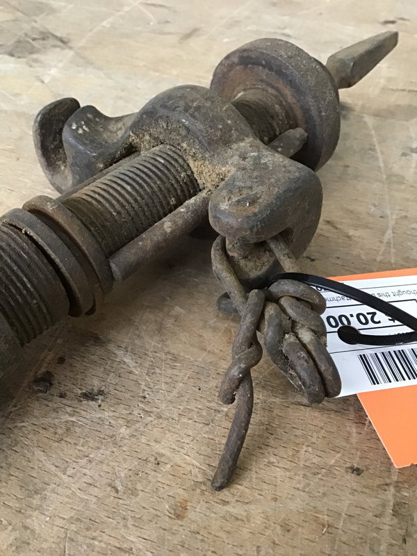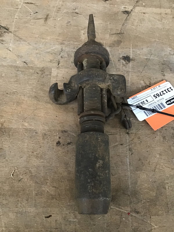 I asked a coworker what they thought this brace attachment was for, and we came up with it being used as an extractor since it looks like it might have had a chain attached to secure it while you crank the brace. An oddity for the tool shelf, for sure. I couldn't find a maker's name on it.