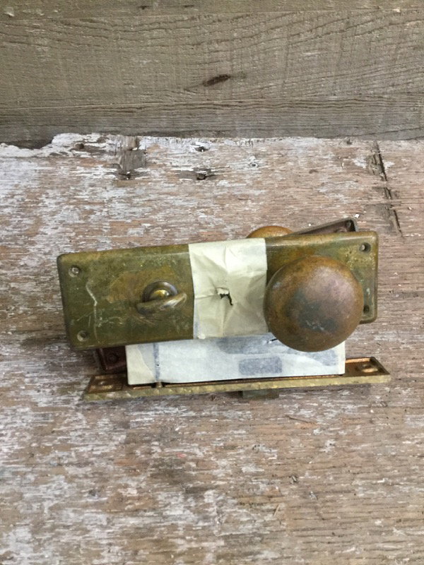 Large vintage exterior lockset made of brass salvaged from a local seminary. Dimensions reflect mortise box.