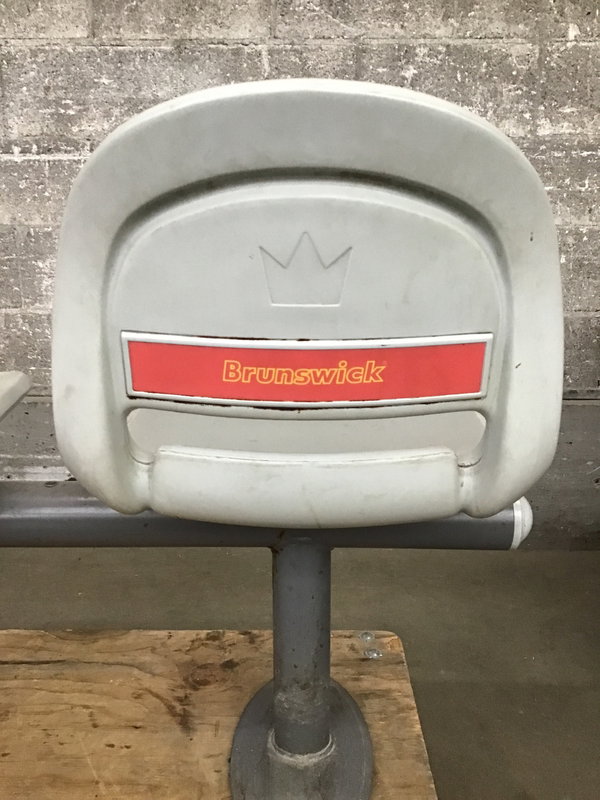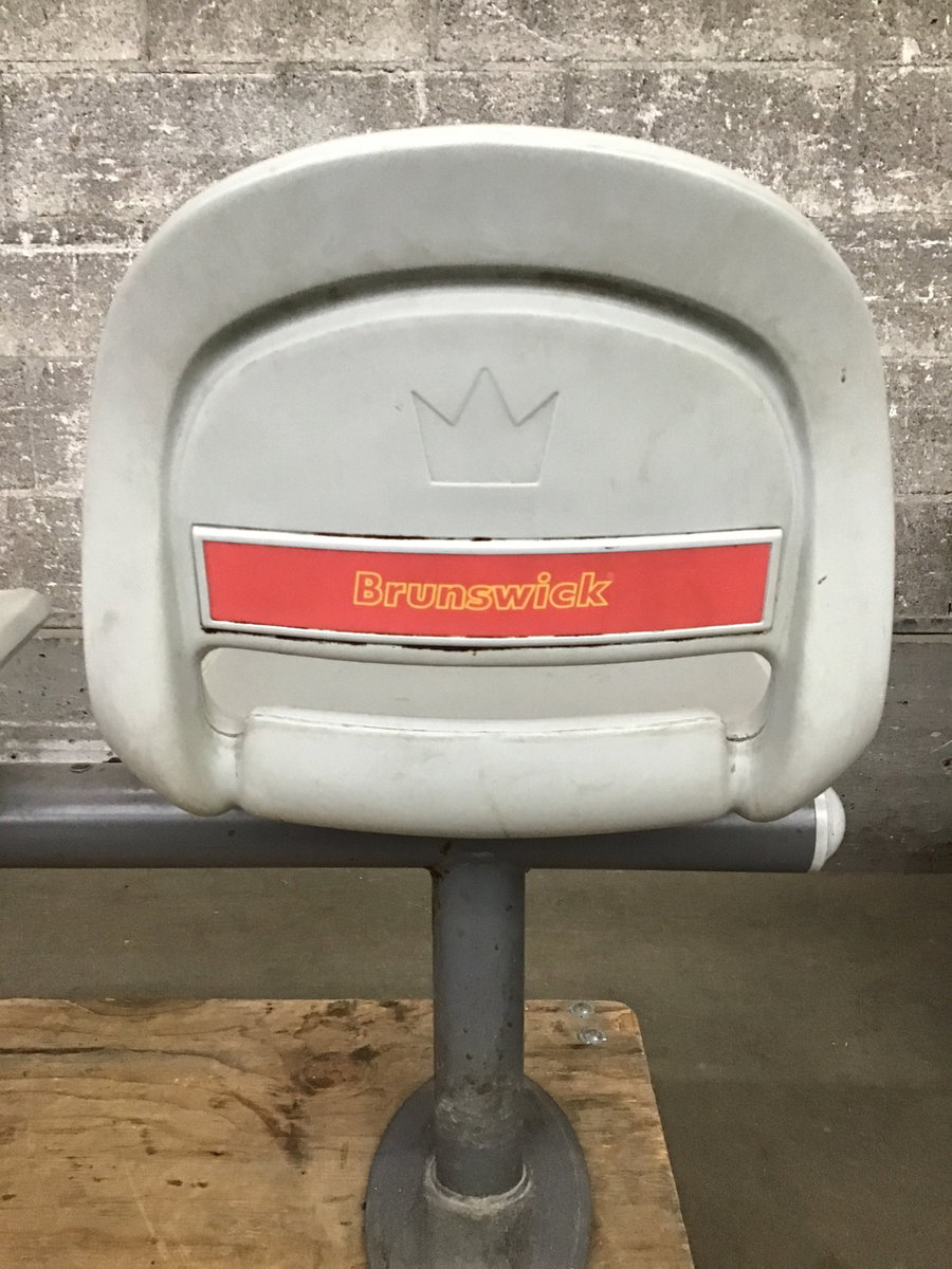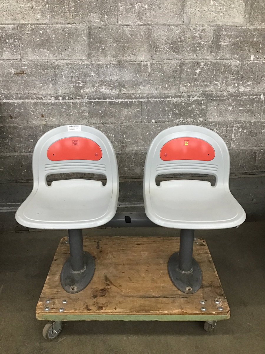 A pair of grey and orange chairs that bolt into the floor. These came to us from a local bowling alley! In used condition with variable amounts of chewing gum included ;)