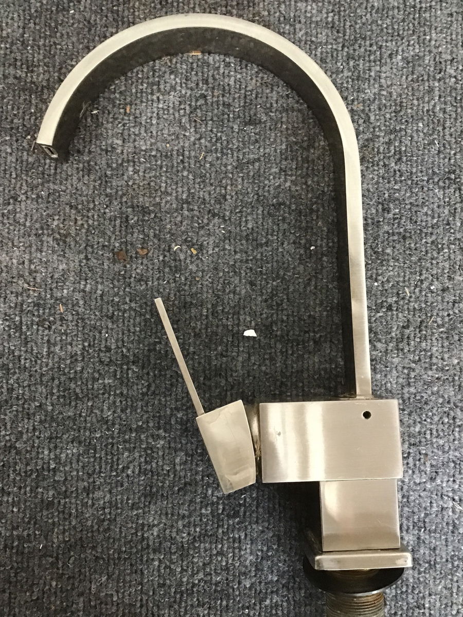 Unsure of the age or brand of this brushed nickel faucet, but it does have a nice modern look to it! It has seen some use for sure and the price reflects.