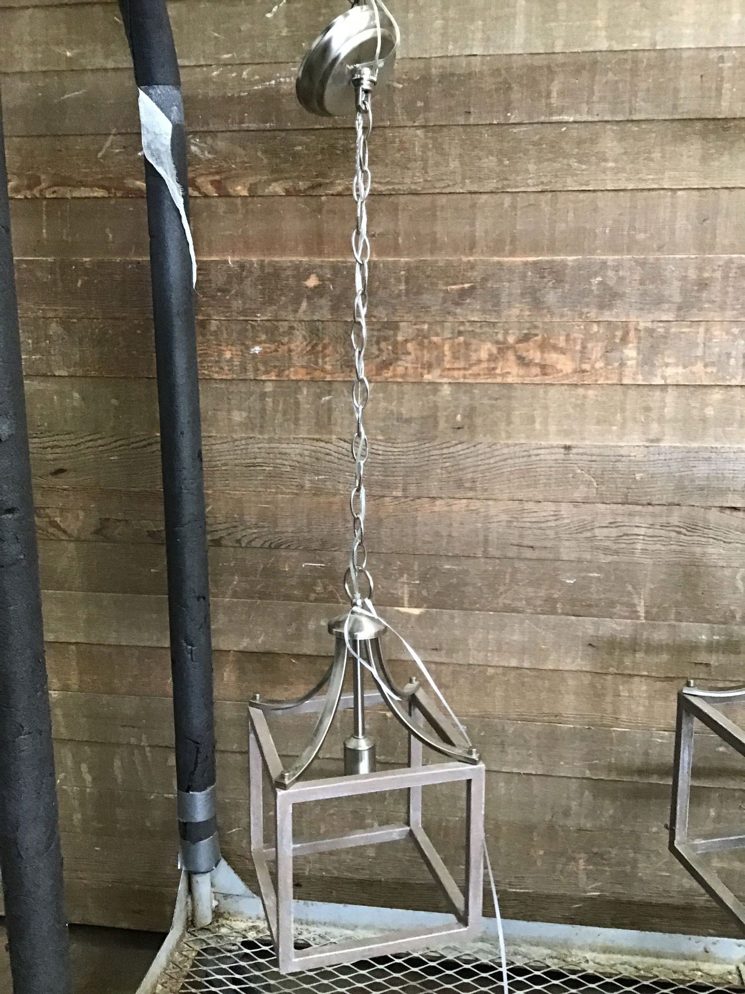 Boswell Quarter brushed nickel mini pendant light with weathered gray wood accents. Wiring looks to be in great shape though we always recommend a full test prior to installation. Available at box stores for $120, see here for details.