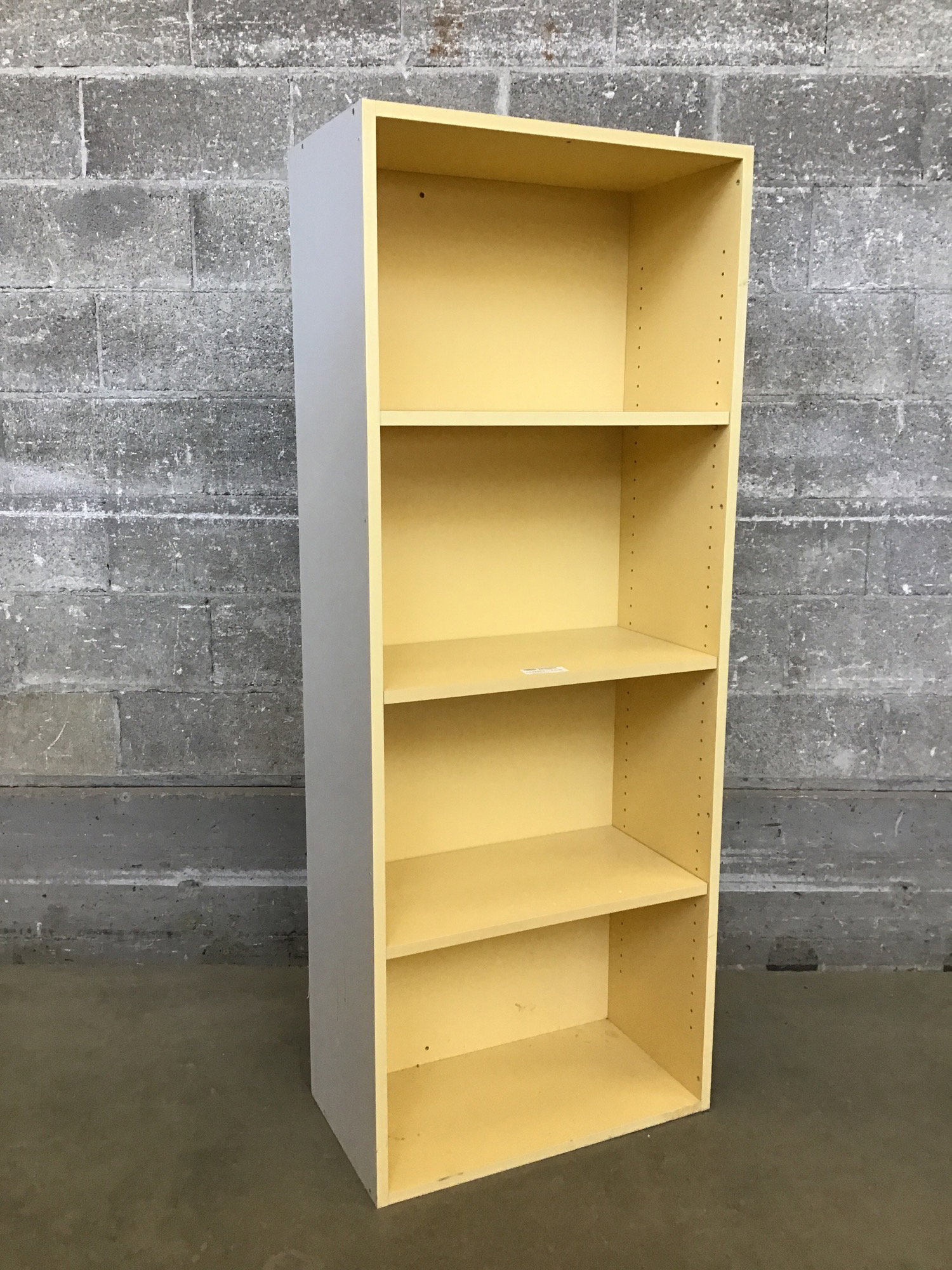 A sturdy MDF/plywood bookshelf in sweet butter yellow with a light grey outside. Has approximately one million height adjustment options for your shelves! Photo may be representational.