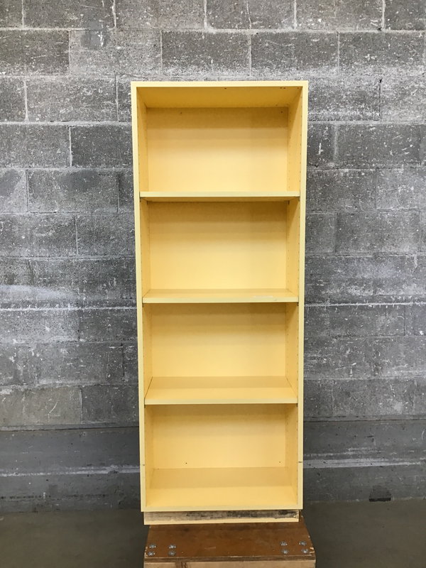 A sturdy MDF/plywood bookshelf in sweet butter yellow. Has approximately one million height adjustment options for your shelves!