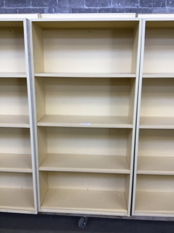 A sturdy MDF/plywood bookshelf in sweet butter yellow with a light grey outside. Has approximately one million height adjustment options for your shelves! Photo may be representational.
