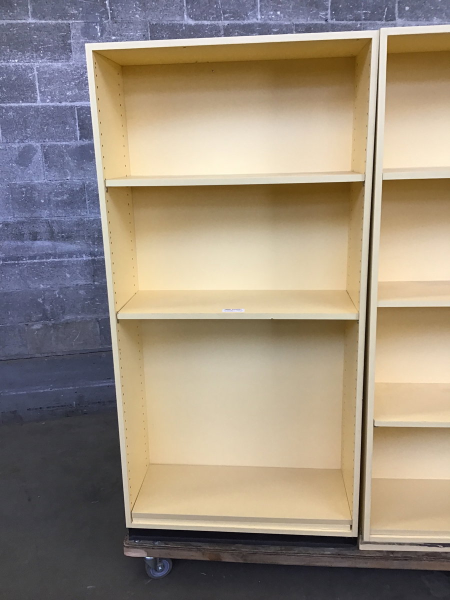 A sturdy MDF/plywood bookshelf in sweet butter yellow. Has approximately one million height adjustment options for your shelves! Photo may be representational.