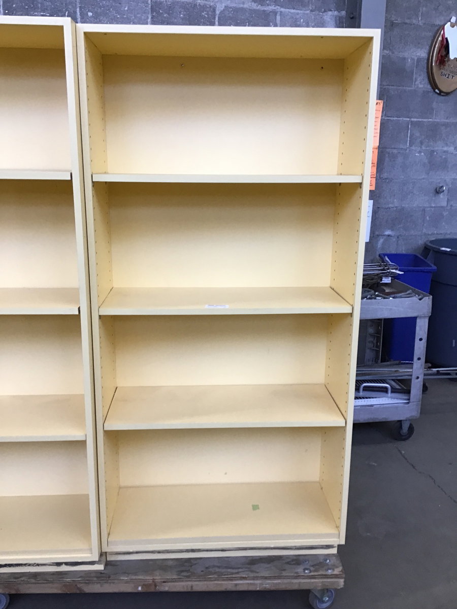 A sturdy MDF/plywood bookshelf in sweet butter yellow. Has approximately one million height adjustment options for your shelves! Photo may be representational.