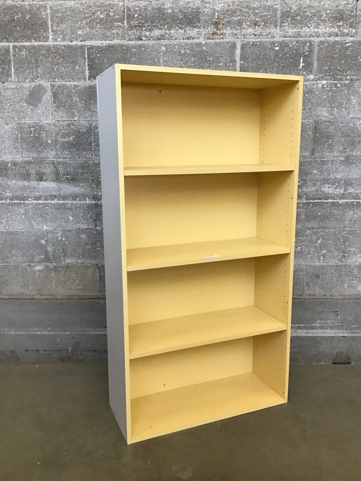 A sturdy MDF/plywood bookshelf in sweet butter yellow with a light grey outside. Has approximately one million height adjustment options for your shelves! Photo may be representational.