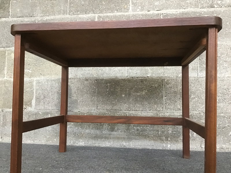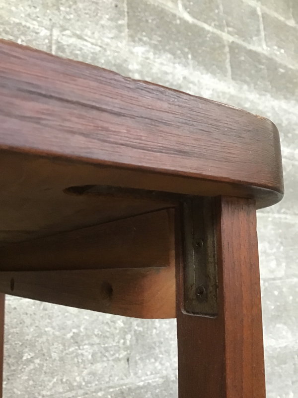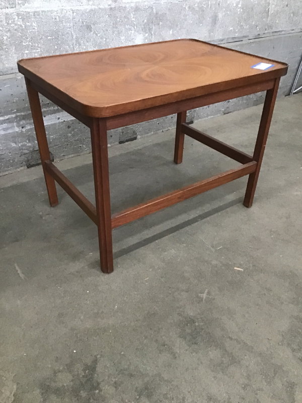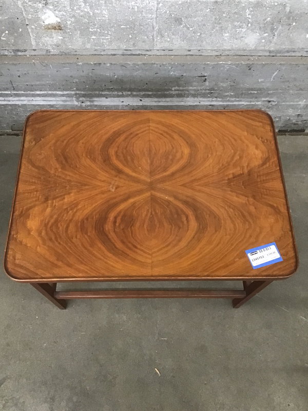 Super sweet looking walnut side table with four panels of bookmatched veneer on the top for quite the butterfly look. Even the edge banding is walnut. The top does show some cosmetic wear and water stains, but still quite a striking piece. It might have once been part of a nesting table set or had a drawer as there is a slot/track for one of those options.