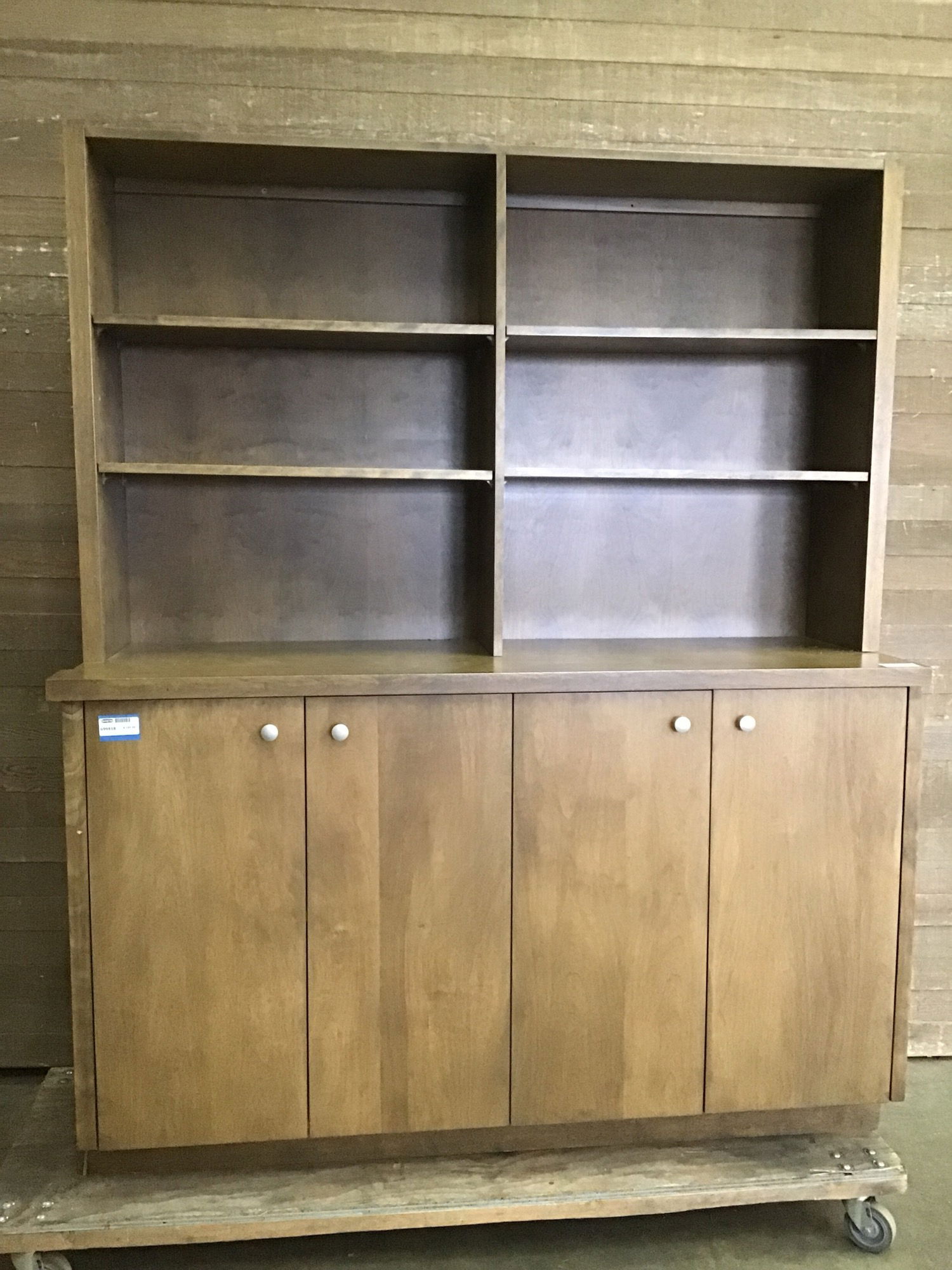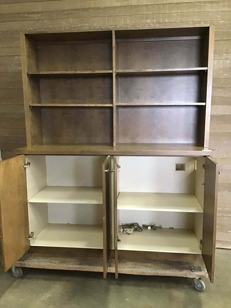 Built-in style cabinet with attached top adjustable shelves. Looks like a birch veneer with a dark wash style stain. In solid shape and ready to add some storage space that's out of the way. Would be great for a utility room.