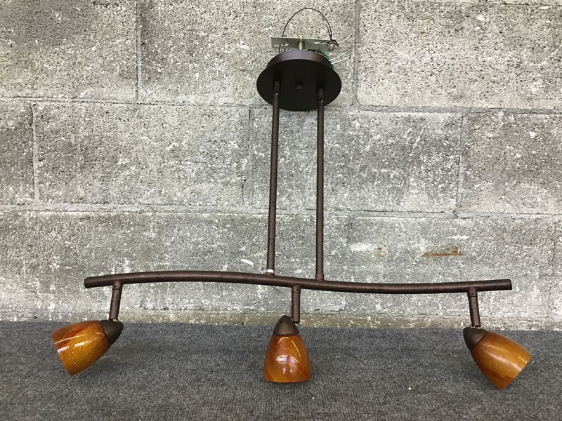 A light fixture with an earthy-toned finish to its construction and multicolored fitters around each bulb. Suitable for sloped ceilings.