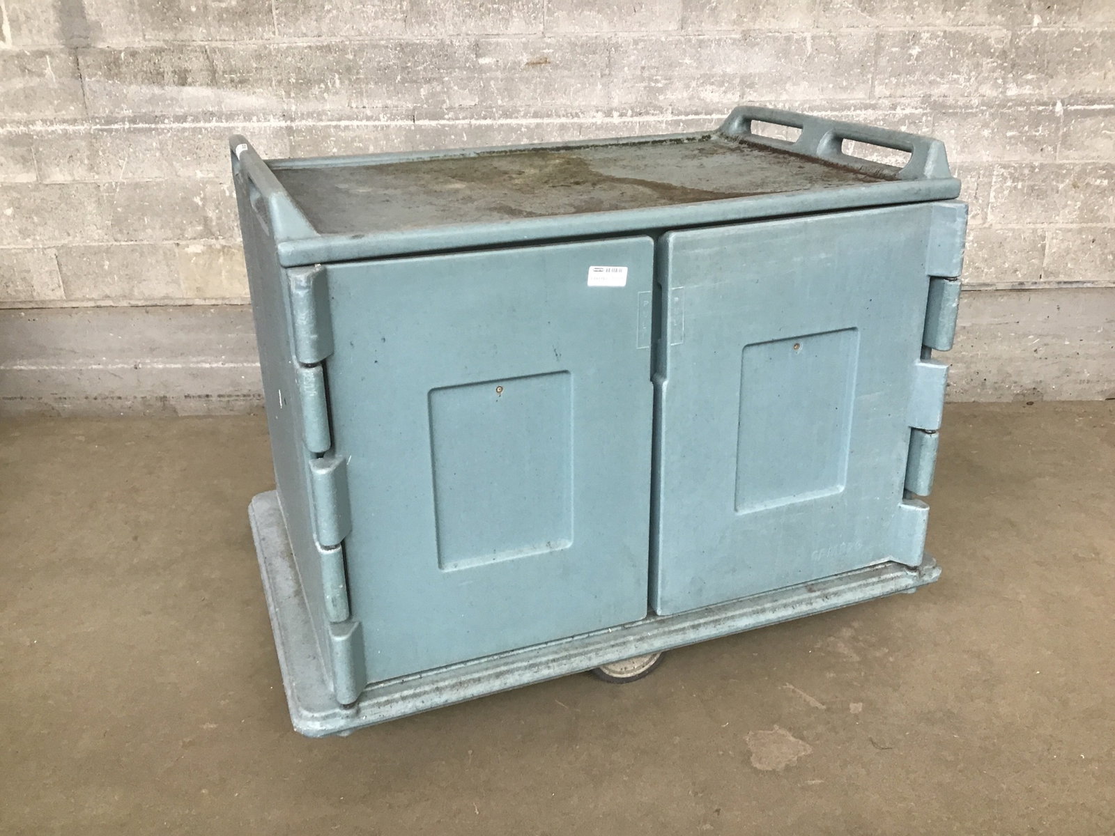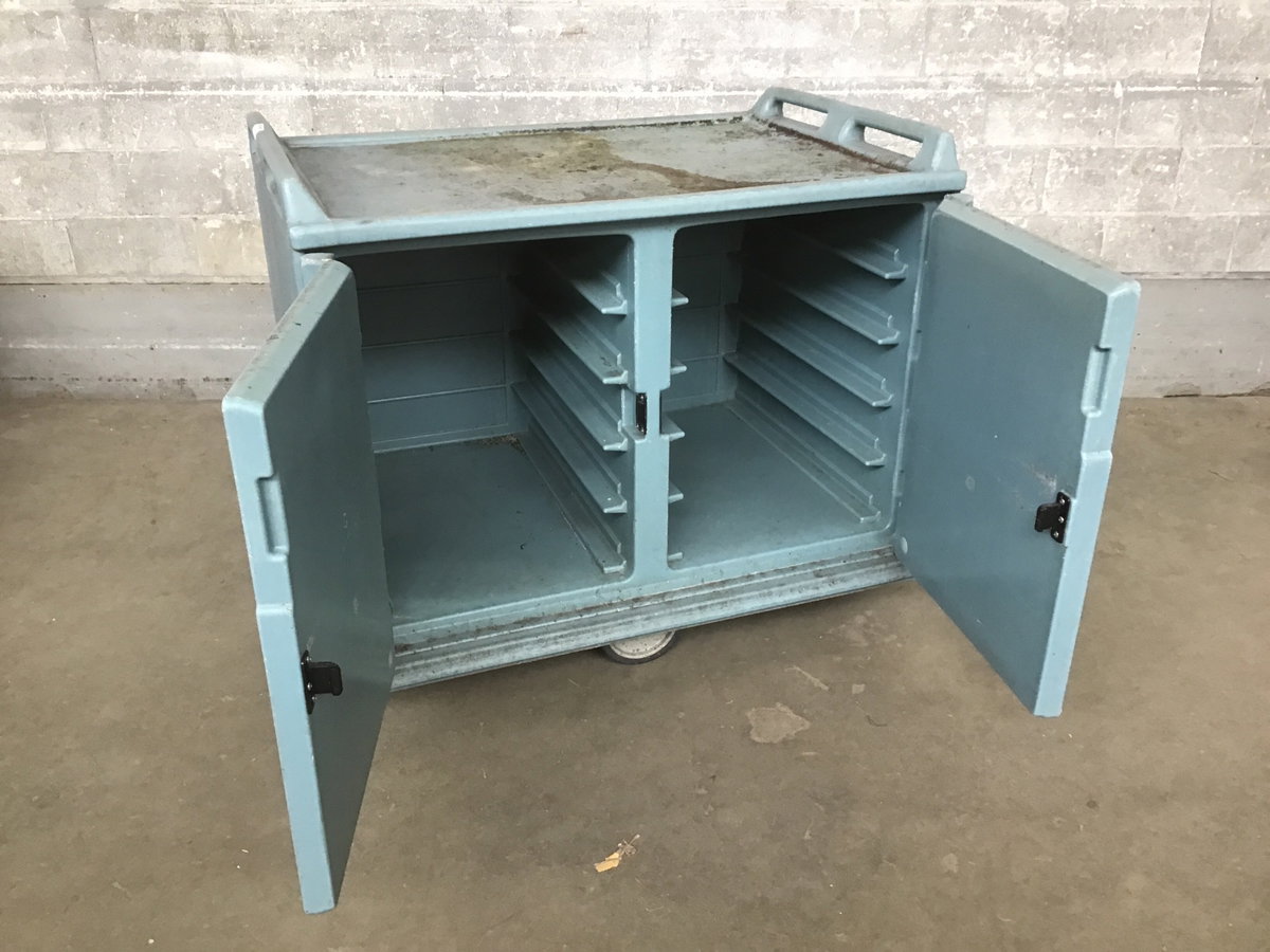 Heavy duty plastic cart made by Cambro. I believe it was once used for food service (has slots for trays behind the two doors. Could make a great shop cart. Just cut some plywood shelves to fit your needs. Dimensions are approximate.