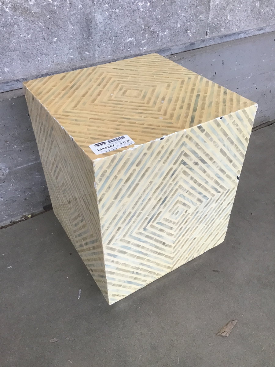 A shimmery end table decorated with capiz shells in concentric geometric patterns. Very organic and beachy! Has a couple chipped spots, but they could be touched up with a lil paint and have no one the wiser.