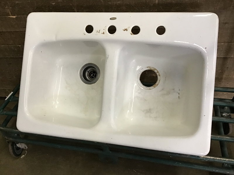 Enameled cast iron Kohler kitchen sink in fair condition. the enamel looks good, though there's wear at the bottom of the bowls from use. Price reflects condition.