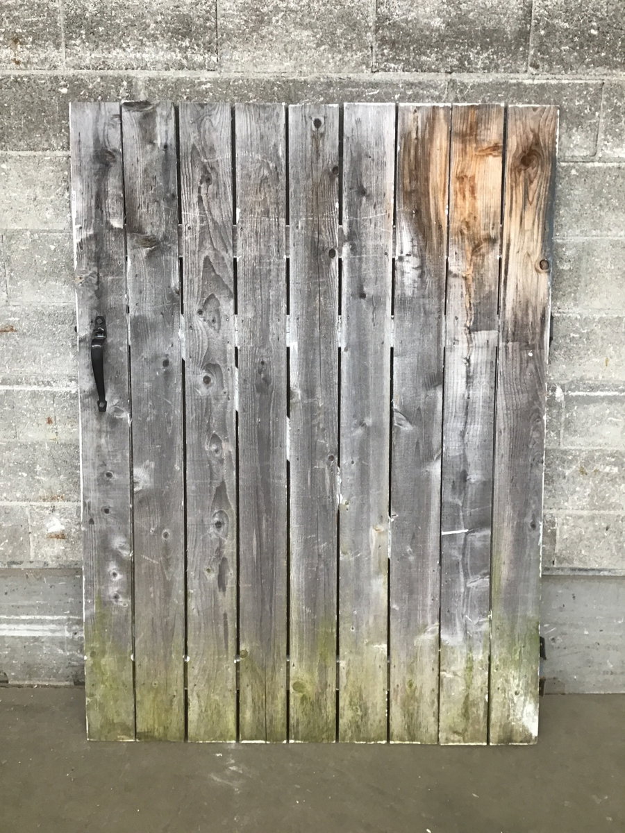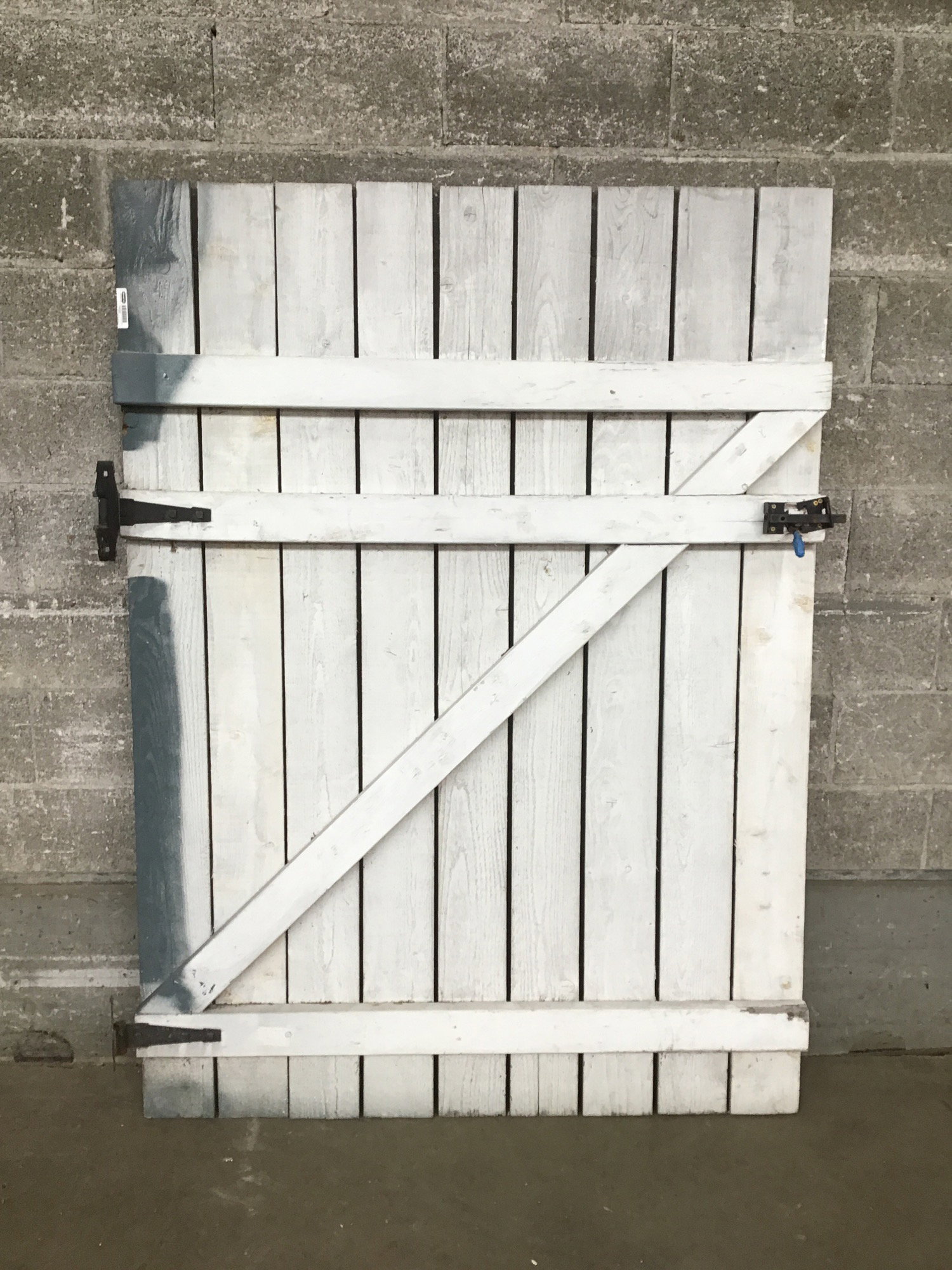 Used but still perfectly usable cedar gate with two strap hinges and a latch. Unfinished on one side, painted white with a little grey/blue overspray on the other.