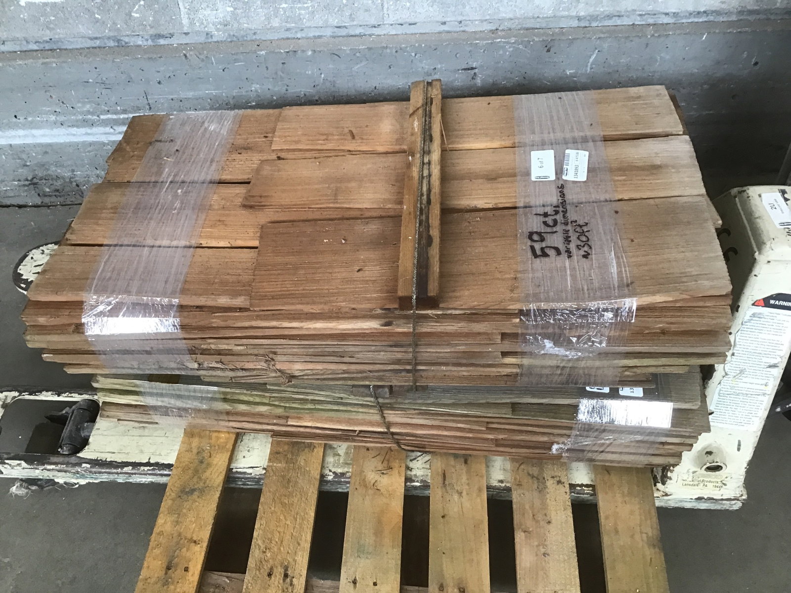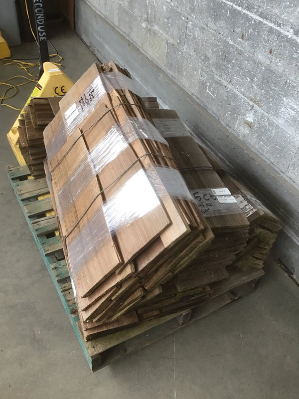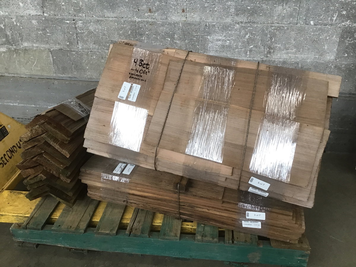A lot of cedar shake roofing in seven bundles. There are about 38 ridge caps which vary in length from 20-24", and around 240 individual shingles which range in size from 3" to 10" wide. Total square footage is fairly subjective depending on your reveal pattern, but a very rough estimate would put the shingles alone at somewhere around 200 square feet of coverage. It looks to be untreated and still has that nice, woody smell that'll stick to your clothes after you handle it for a while
