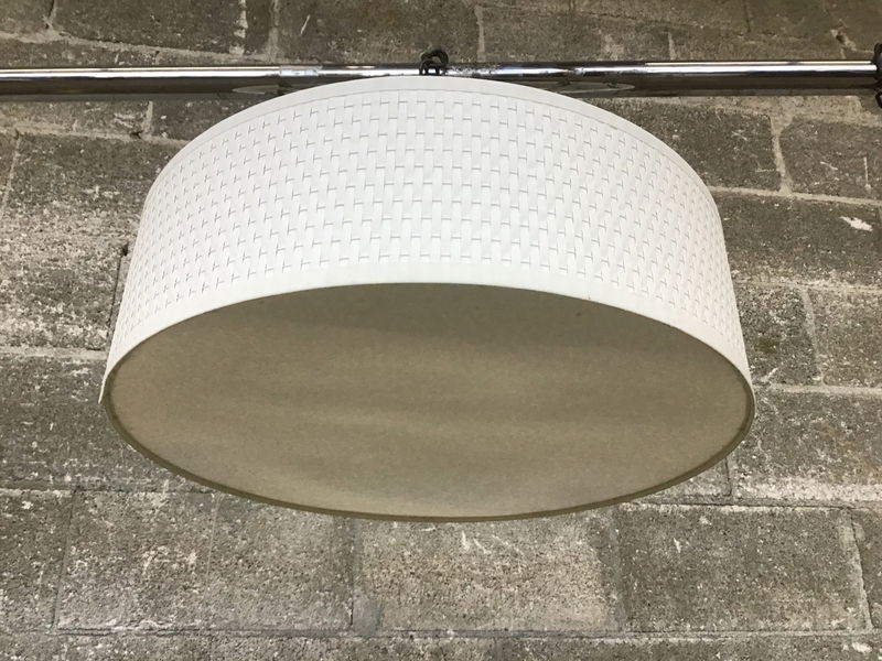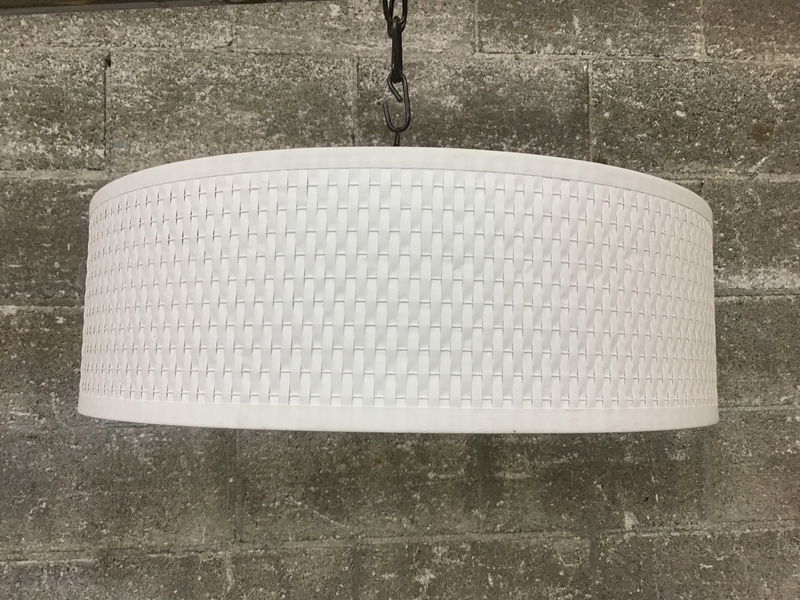 Ceiling light with fabric cylinder shade.