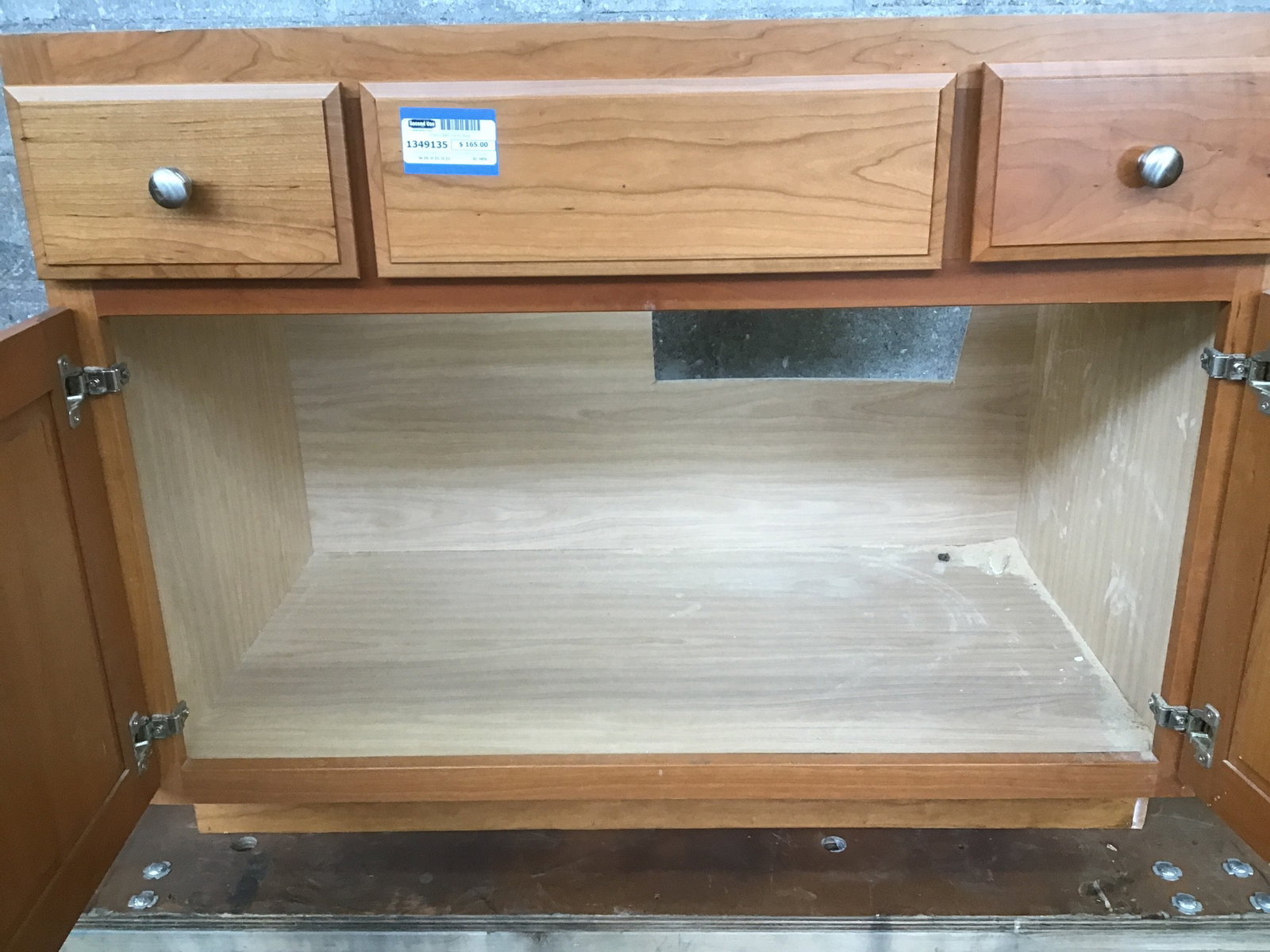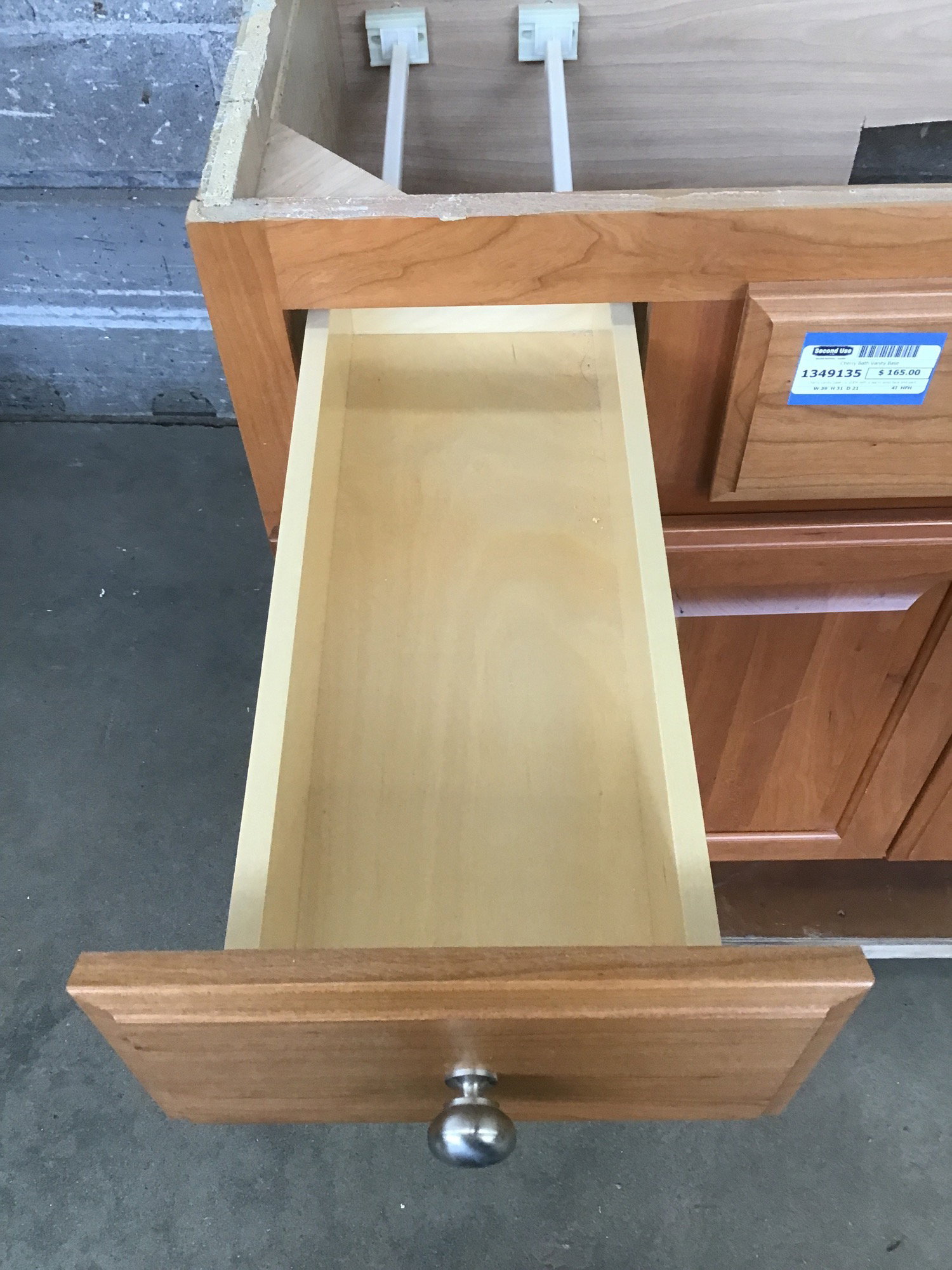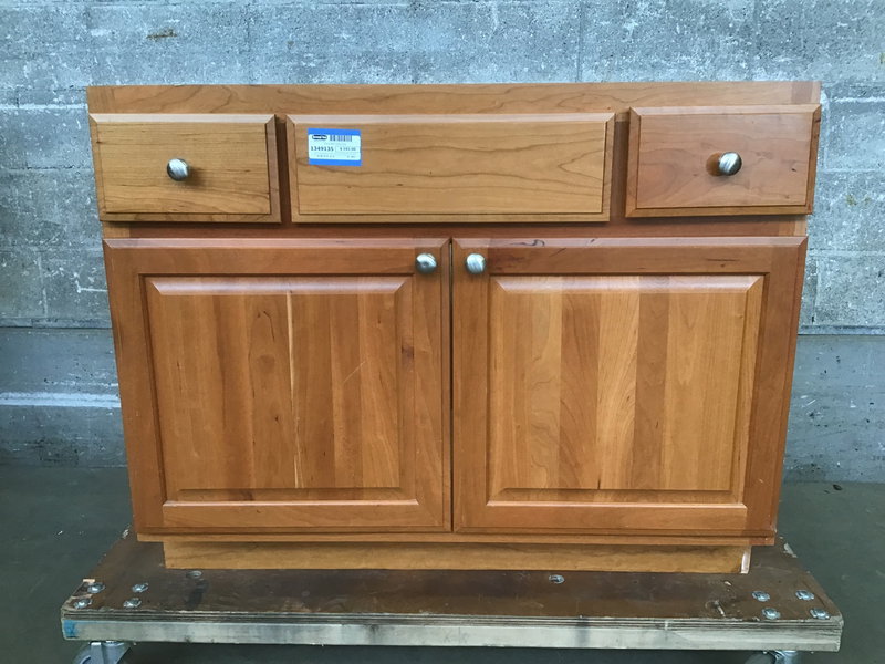 Cherry vanity base ca. 2004 with a warm solid face and particleboard box. Just needs a counter and she's ready to roll. Good compact size for a little apartment, ADU, or van-life situation.