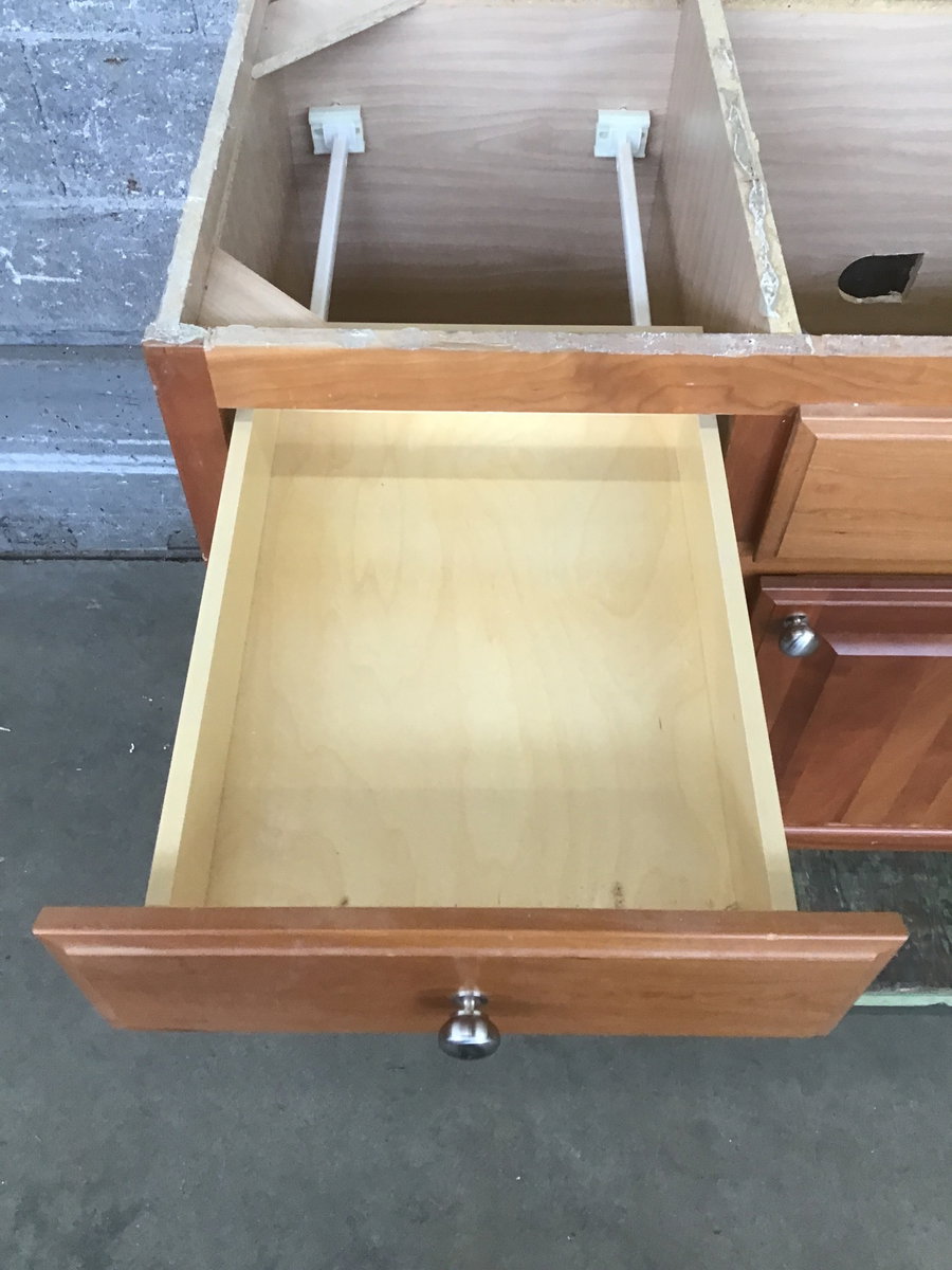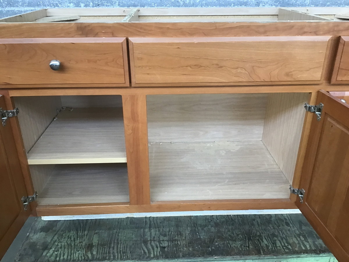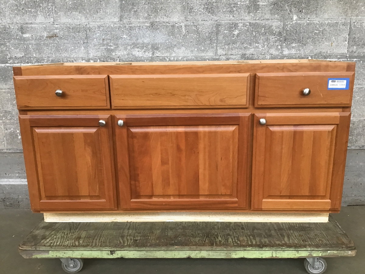 A bathroom vanity cabinet with a particle board construction, cherry face, raised paneling details and brushed nickel hardware. This would make for a charming bathroom vanity in a home that appreciates the warmer shades of wood grain.
