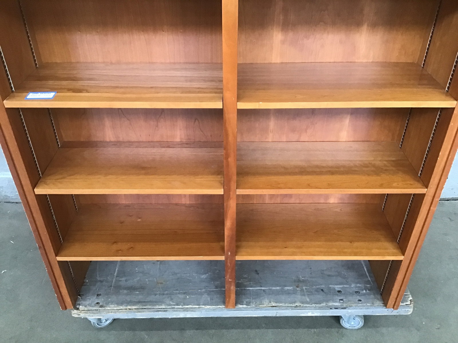 Handsome bookshelf unit with two separate sides and four adjustable shelves on each side. Warm stain and swirling cherry grain throughout. Unfinished on the sides and is missing a bottom surface, would look great on top of another piece of furniture or with just a panel added underneath.