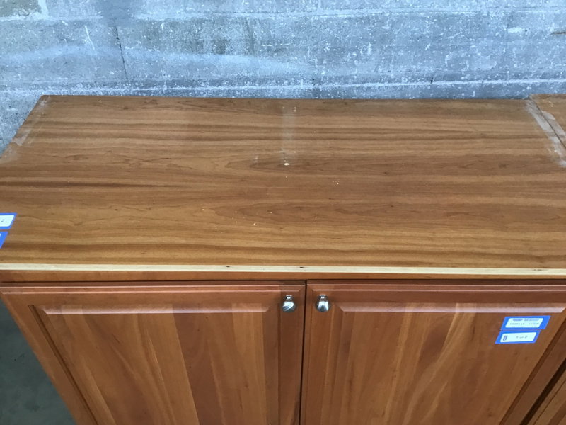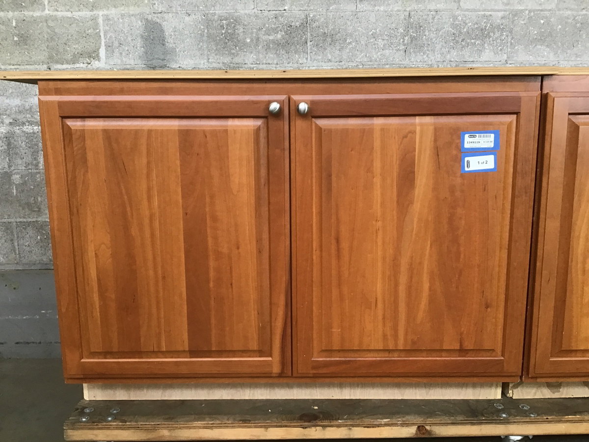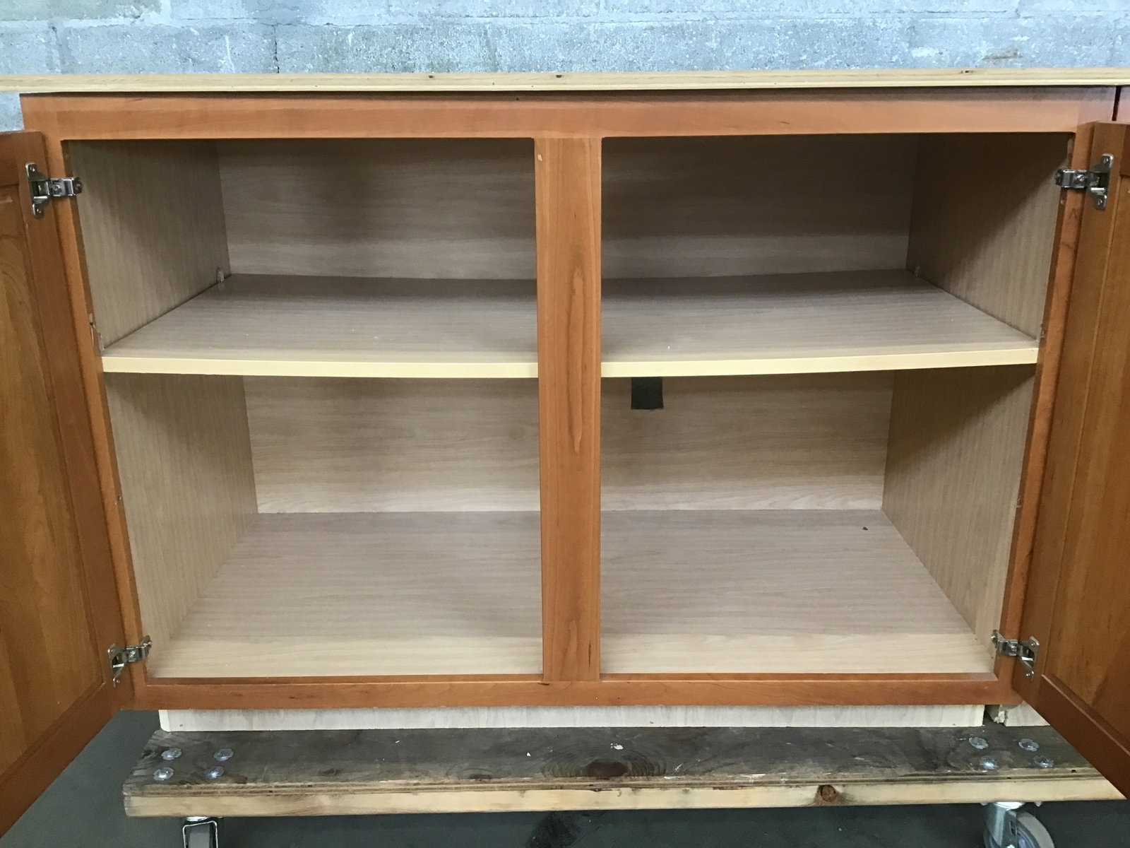 A base kitchen cabinet with a particle board construction and a cherry wood finish. The cabinet has two doors and one larger repositionable shelf. Also includes a larger plywood surface with a faux cherry finish.