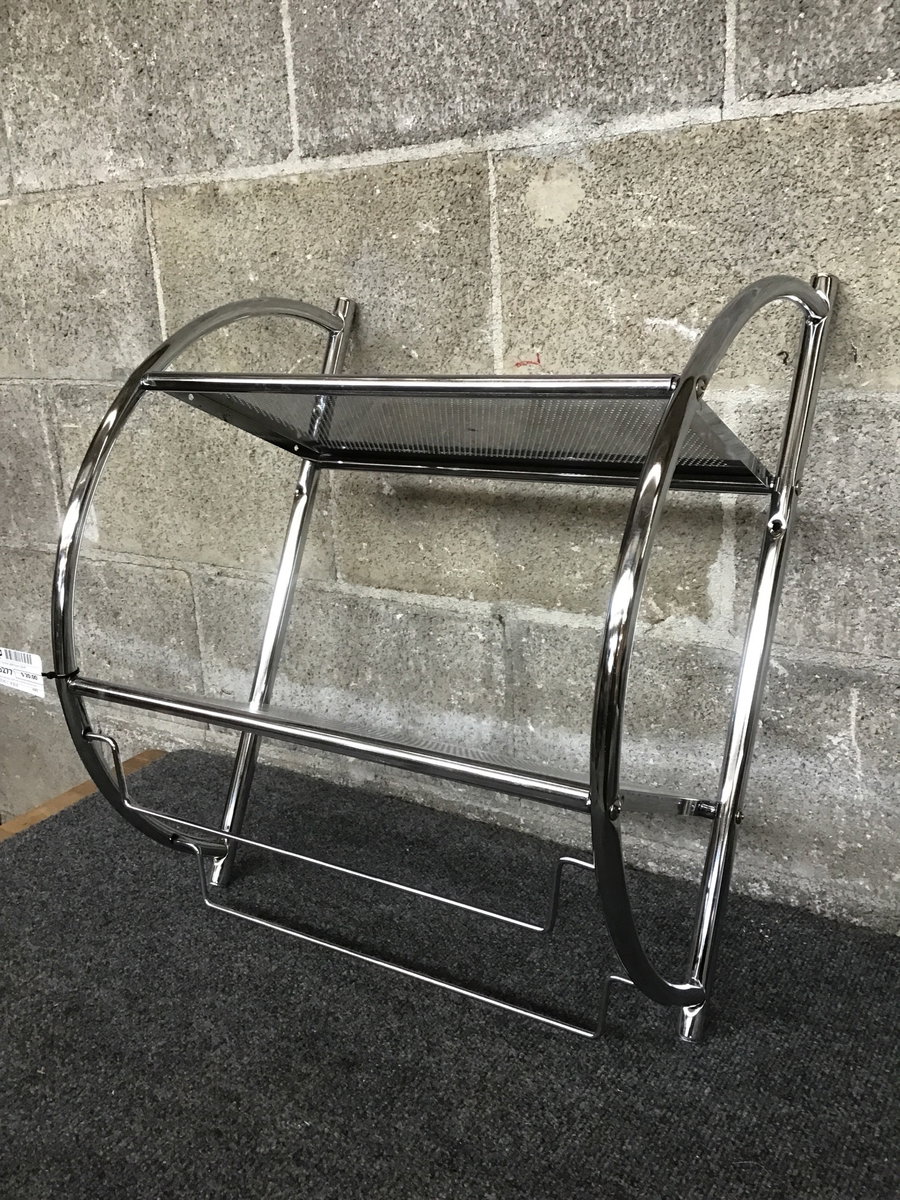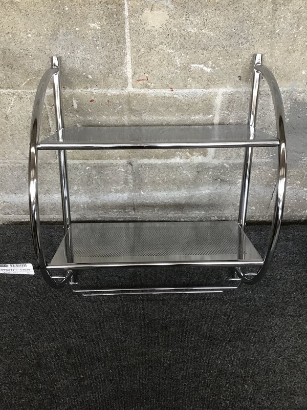 A solid metal bathroom shelf with a shiney chrome finish. This shelf features two tiers of storage space, two towel holders and a sleek spacey finish.