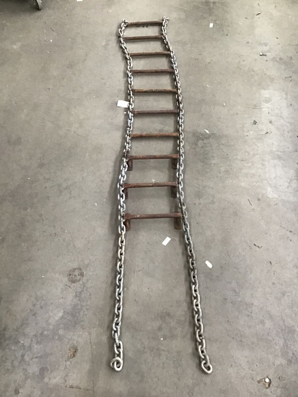 Salvaged from the Foss Tugboat Shipyard in Queen Anne, this beefy steel chain ladder is full of history AND repurposing potential. It would make a pretty epic treehouse ladder if I do say so myself. Three of the rungs have mounting brackets, the rest hang loosely. Spacing between rungs is approximately 10", width measures 20.75". Height listed is rung-to-rung, the full length of chain measures 150".