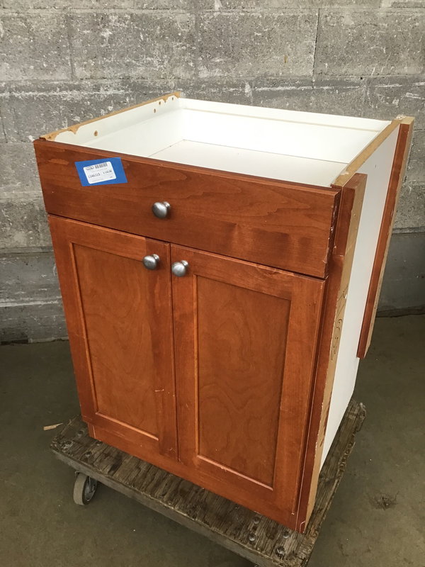 Kitchen base cabinet featuring solid wood one panel doors with a cinnamon stain, particle board box construction, brushed nickel pulls, one adjustable shelf, and a plethora of storage space.