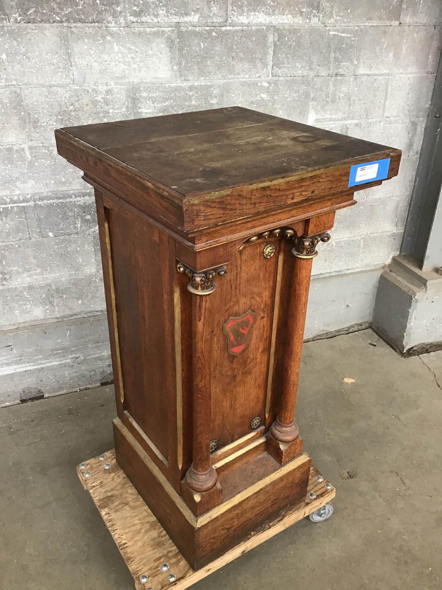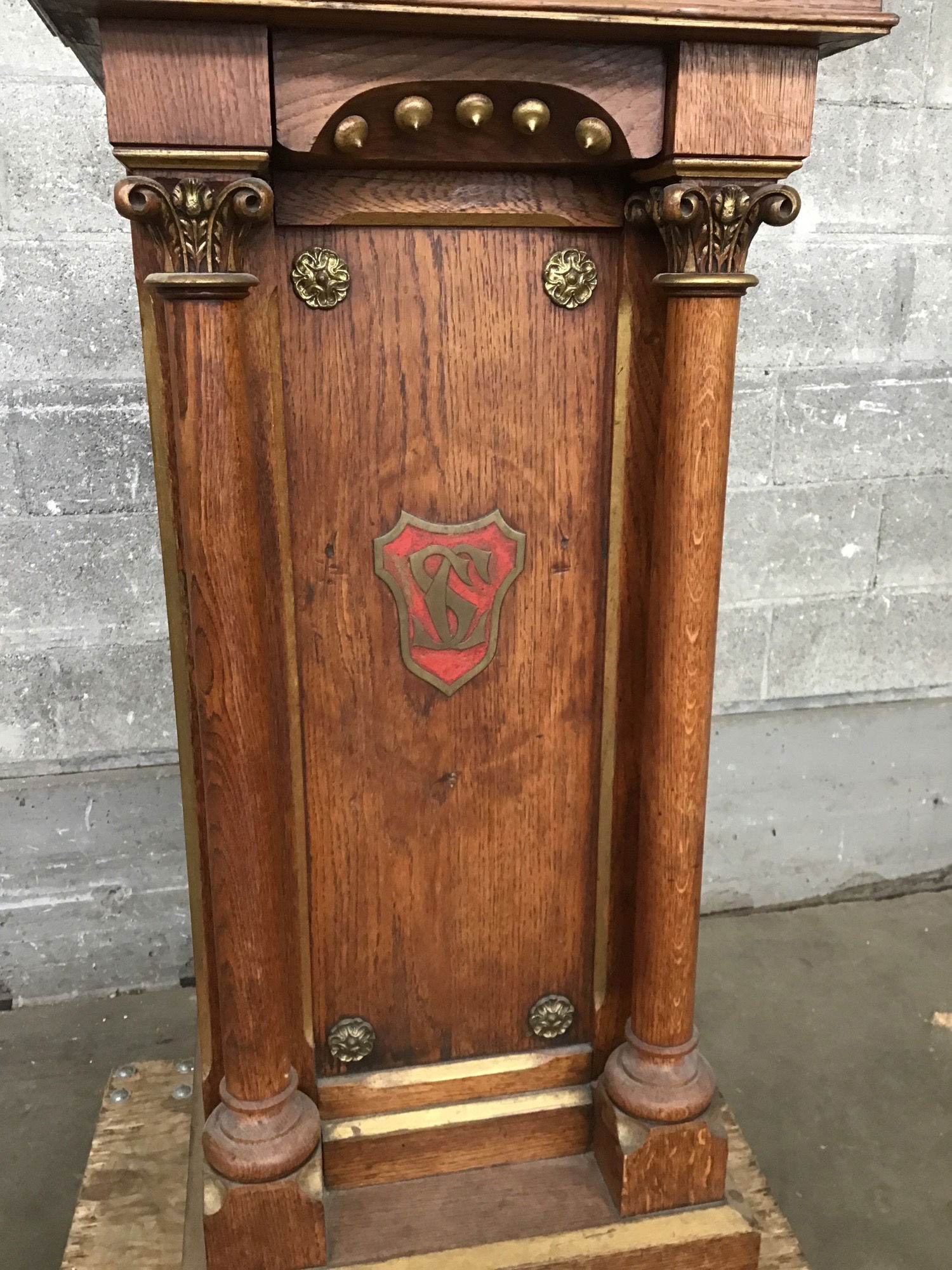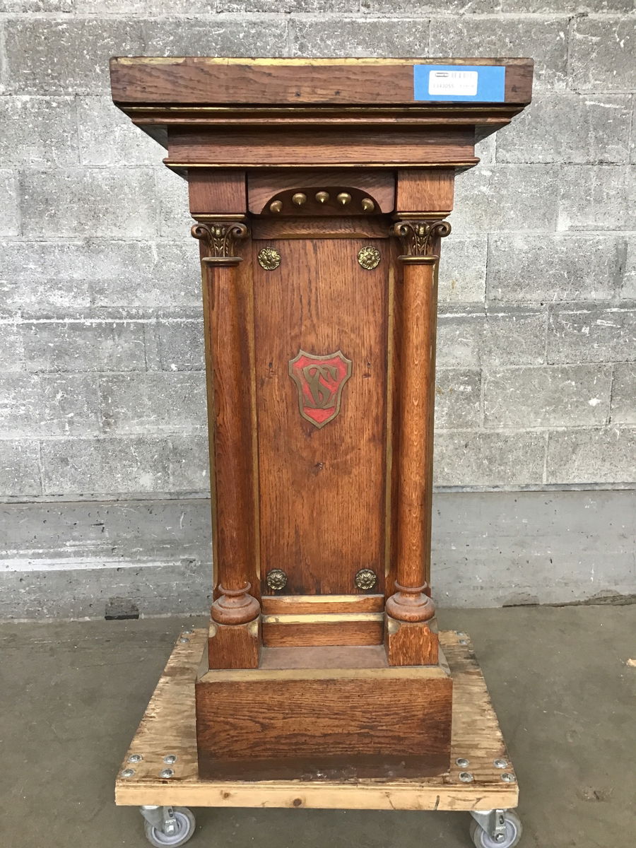 Classy vintage Oak lectern primed and ready for your next soapbox moment or a worthy planat! This custom piece is well-preserved and full of classy details like gilded accents, columns, and a center crest bearing the initials SC.