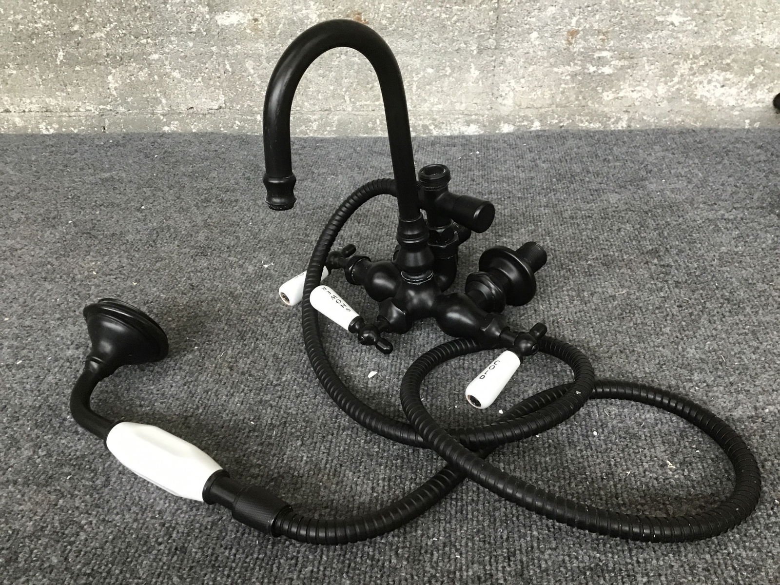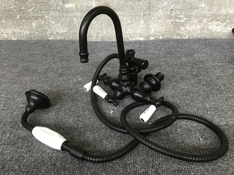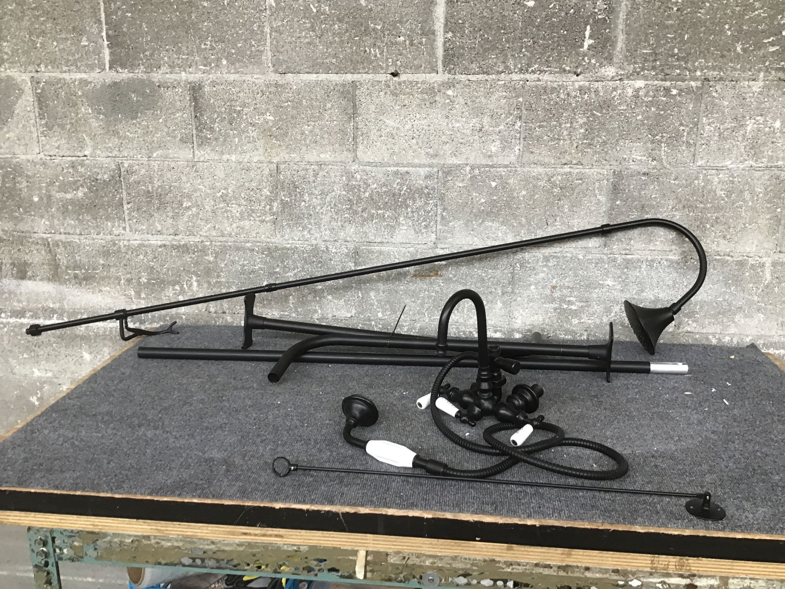 This is a clawfoot tub shower hardware set from Kohler that includes: curtain rod & rings, pop-up drain, trim, stabilizing arm, shower head, and faucet. Everything is finished in matte black.