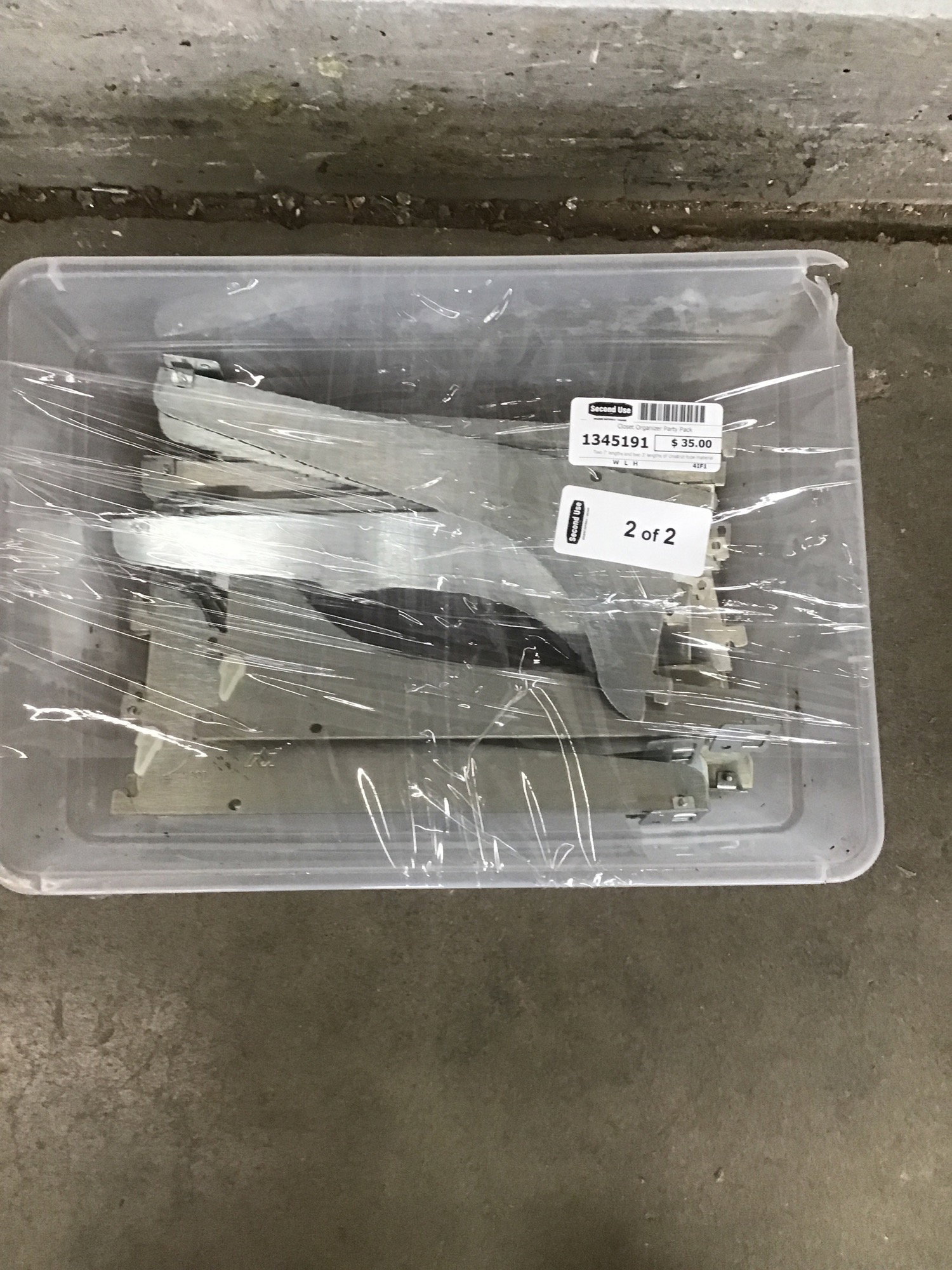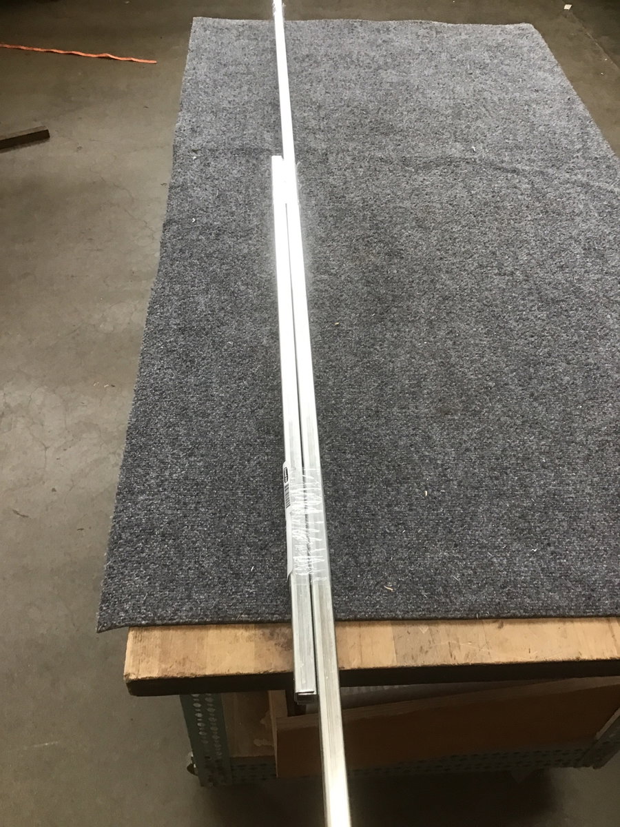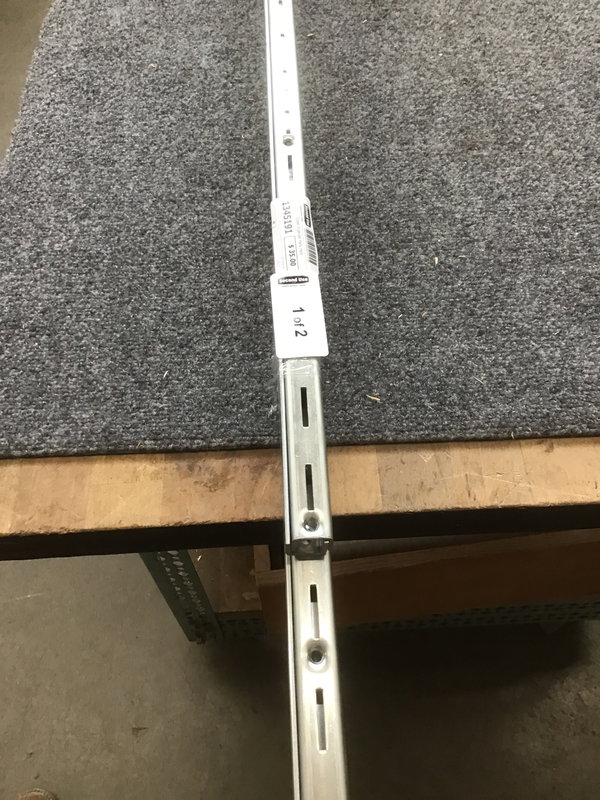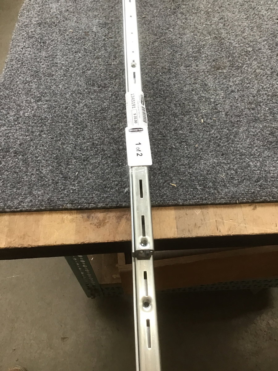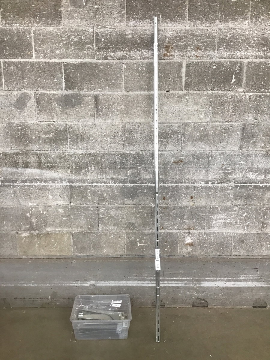 Two 7' lengths and two 3' lengths of Unistrut-type material with twenty metal shelf brackets that hook into the struts. In good shape, and would be a great option to create a modular, DIY storage setup.