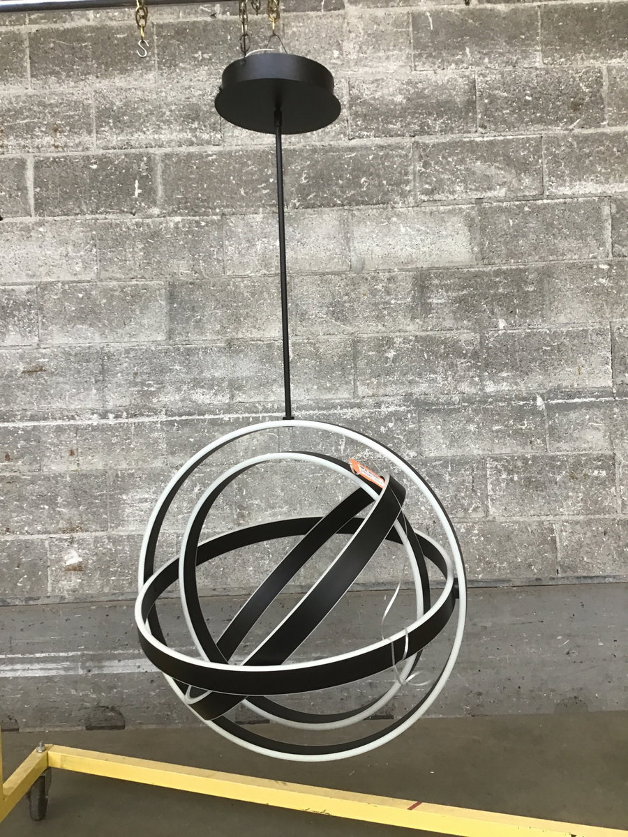 A pendant light fixture with four rings inside of each other that can all move into different positions. It has a matte black finish and a diffused cover over the LEDs. Made by Modern Forms as part of their Kinetic line. Retails new for about $1800.