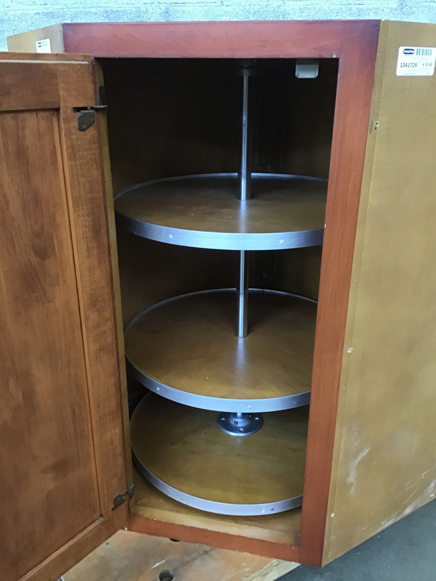 Upper lazy Susn cabinet with medium stain face.